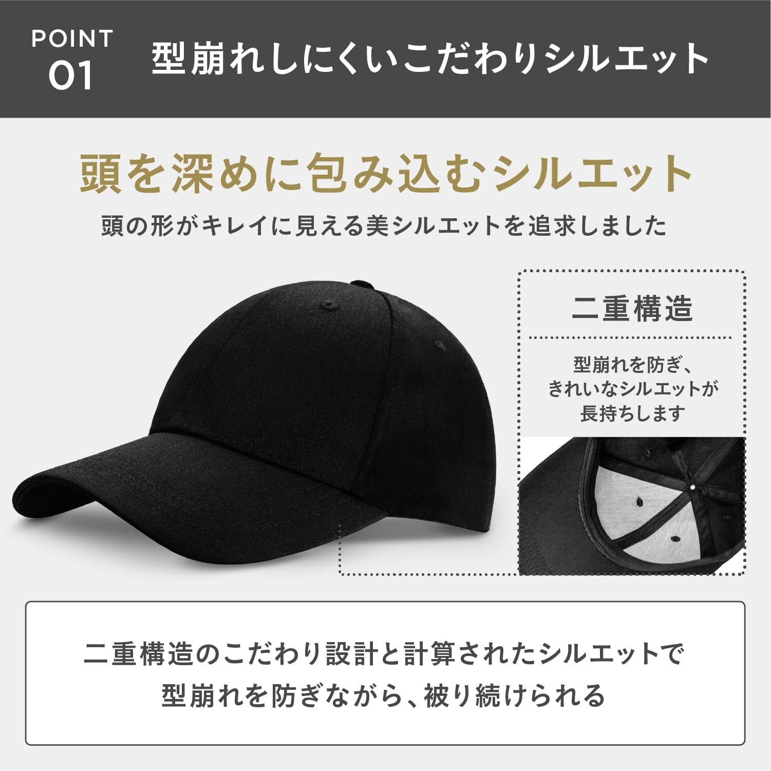 【型崩れ防止】キャップ前面の内側はダブルファブリック構造で、型崩れを防ぎます。クラウンの前面部分を強化し、美しいシルエットを長期間保ちます。配送時の型崩れ防止にも配慮しています。また、使用されている高品質なコットン素材は通気性も良好です。