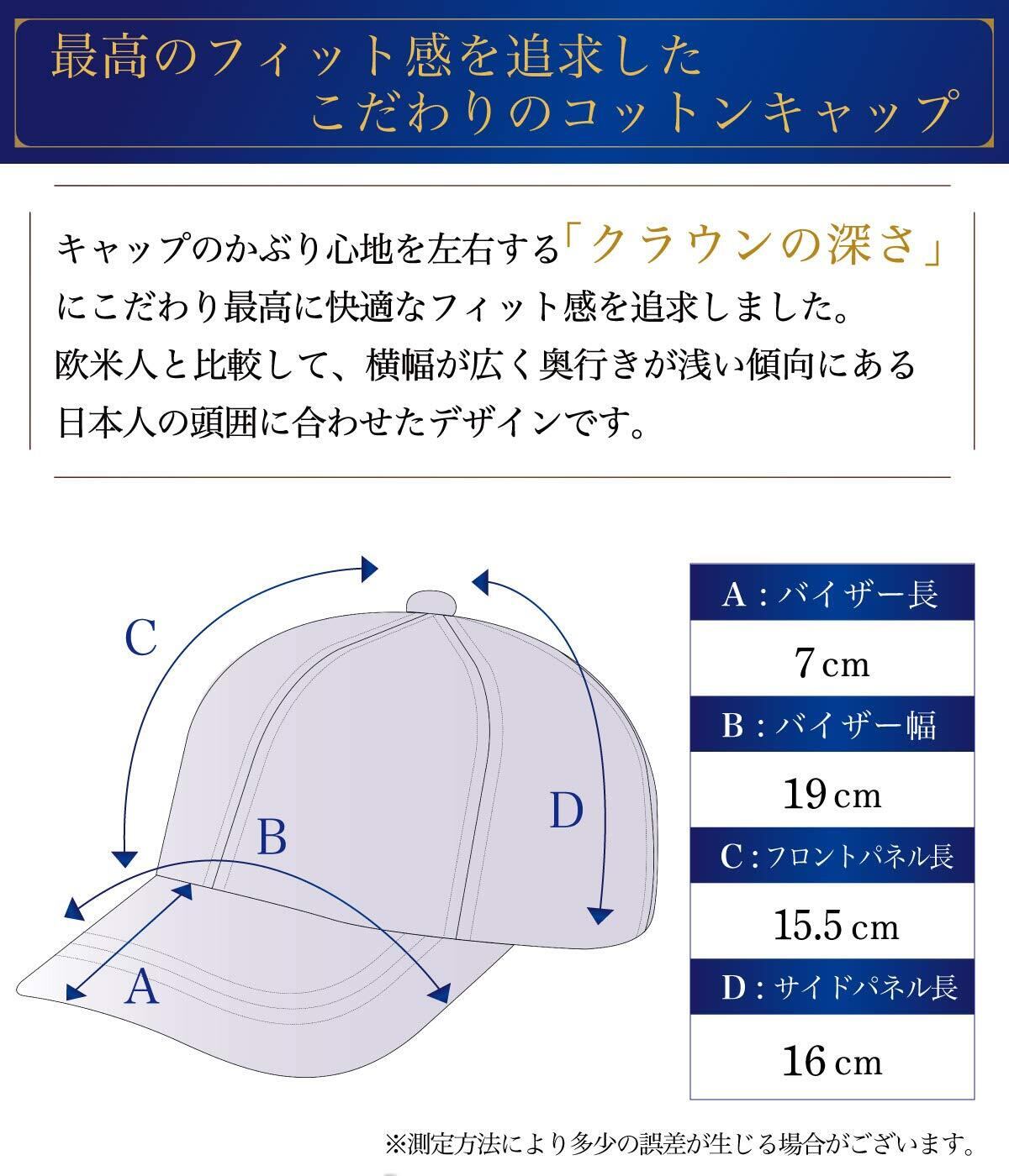 【 快適フィット 】快適なかぶり心地と最高のフィット感を追求したコットン生地のベースボールキャップです。かぶり心地を左右する帽子のクラウン部分に着目し、最良の深さと奥行きを考え抜きました。一般的な日本人の特徴である幅が広く奥行きが浅い頭の形にフィットするように、キャップのフロント部分、サイド部分など各パーツの長さ・サイズを検討し、快適なフィット感を追求したキャップです。