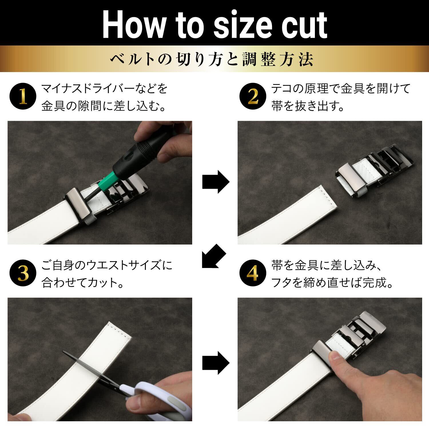 【無段階調節可能!フィットバックル式ベルト】ベルト穴がなく、ウエストにしっかりフィットするよう微調節ができるメンズベルト。便利なオートロック式で、食後などベルトを緩めたい場合にもちょうどいい所で調節が可能です。また、穴がないため帯が劣化しにくいのもポイント。帯は耐久性に優れた人工皮革を採用しています。開封当初は帯は硬いですがすぐになじみます。ウェストサイズに合わせて帯をカットしてください。着脱はバックルを斜めに傾けると簡単です。