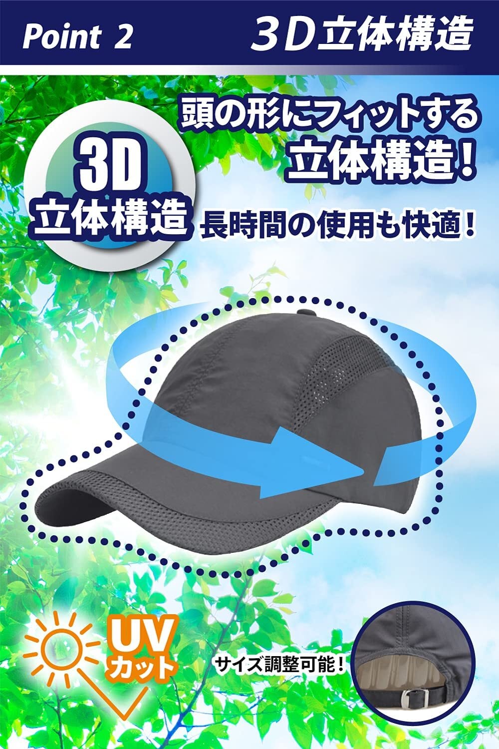 【人間工学に基づく、3D立体設計】 人間の頭の形に沿って設計された、立体構造のデザイン。締め付け感や不快感を無くし、軽いフィット感を実現しました。 【UVカット:日焼け対策に】 日常で、紫外線をそのまま浴びていませんか?このキャップはUVカットもOK。普段の生活で、つば付き帽子のご使用をおすすめします。