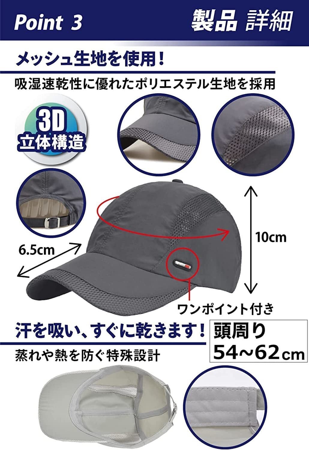 【 超軽量:快適さが違う 】 着用を忘れるほどの軽さ。 ランニング・ジョギングなど様々なスポーツシーンで活躍する、機能性メッシュキャップです。 【吸湿・速乾・高通気性】 帽子で大事な『快適さ』を追究。 汗をかいても蒸れにくく、暑くなりにくい速乾性のポリエステル生地を採用。 また、頭部の左右に通気性の高いメッシュ生地を施し、キャップ内部にある水蒸気・熱気を外に逃がし、快適さをキープします。 【生地へのこだわり】 軽量かつ速乾性に優れた、肌触りの良いポリエステル生地を採用。 吸湿&速乾で、汗をかいてもすぐ乾きます。 長時間使用しても快適です。