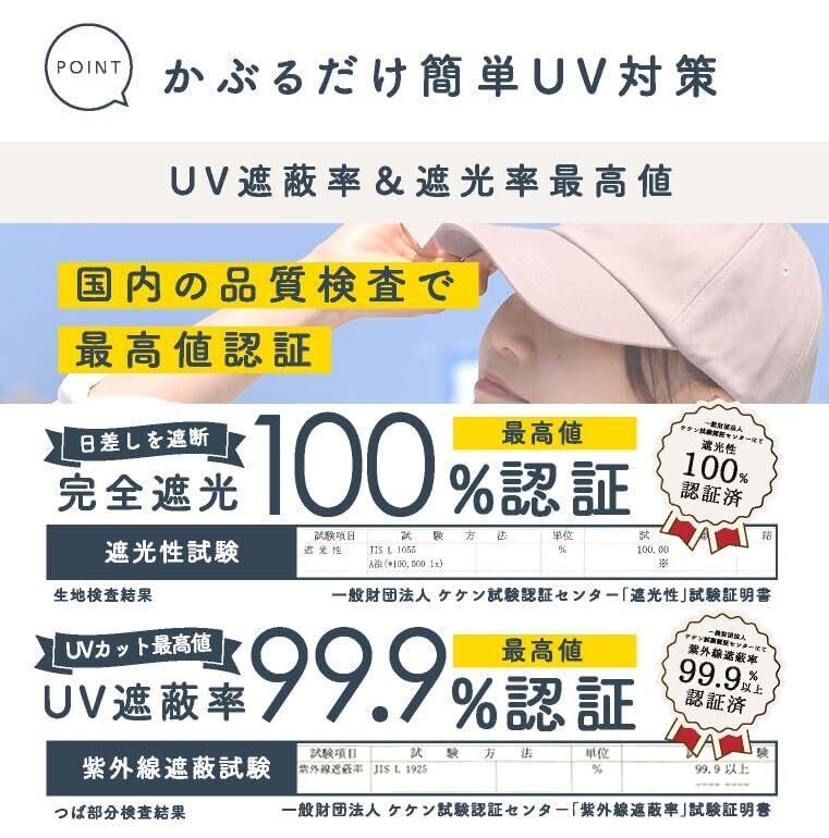 キャップでかぶるだけ紫外線・UVカット! 強い日差しから頭皮の日焼けをしっかりガード。 カーブの効いたツバがかぶるだけで顔回りをUVから守ってくれます。 さらにこちらのキャップ、一般財団法人 ケケン試験認証センターにて、 紫外線遮蔽率最高値99.9%、遮光率最高値100%を認証されました。