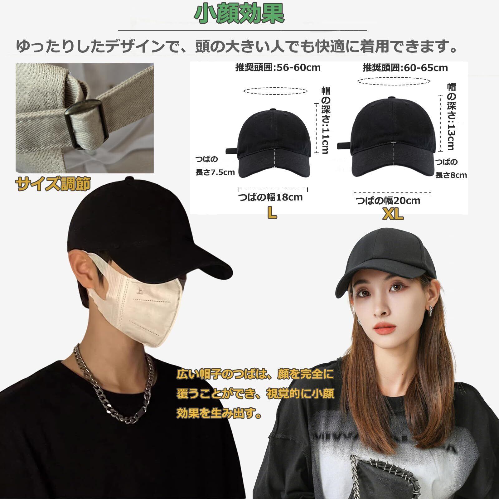 【サイズ調節】L適用可能な頭囲の範囲は56~60cm です。XL(大きいサイズ)適用可能な頭囲の範囲は60~65cm です。帽子の頂が柔らかく、頭の圧力を軽減し、長時間かぶっても心地よいです。帽囲みはサイズ調節可能な設計を採用しています。頭の大きい人がかぶっても締め付ける感じが全くありません。メンズ、レディース問わず、年齢も幅広くお使いいただけます。
