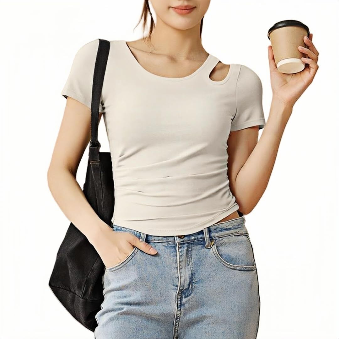 【新春セール】[Asodeer] ヨガウェア レディース トップス プラクティスシャツ 半袖 tシャツ アシンメトリーカッティング カップ付き 吸汗速乾 ショート丈 ストレッチ バレエ テニス フィットネス 運動用 | 無意味ステッカー