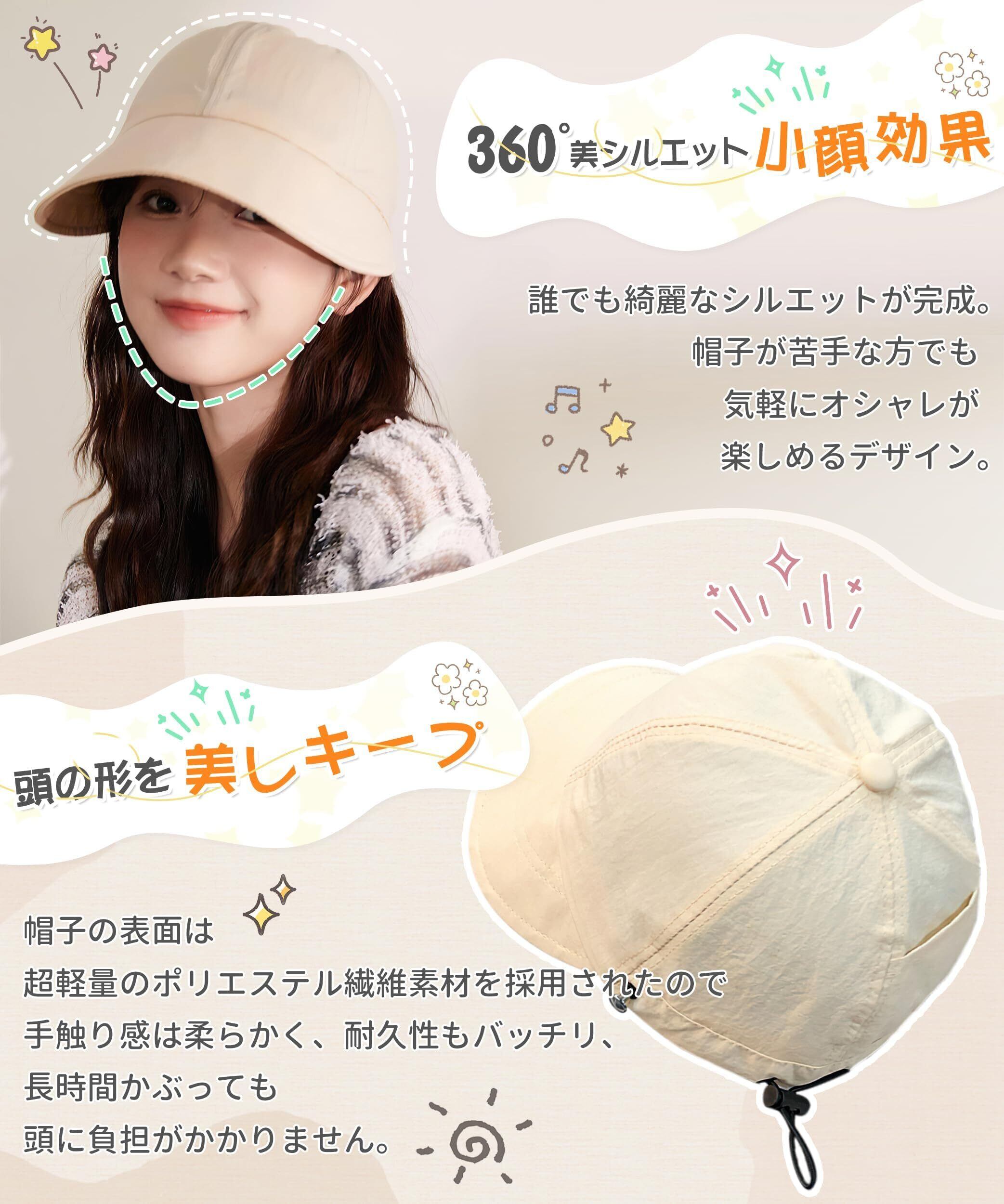 【超軽量設計・理想的な女優帽】(頭囲に合わせて購入し、調節コードを無理に引っ張らないように注意してください。)ツバの長さ8.5cm 深さ14cm 帽子はフリーサイズで(頭囲:約53~58cm)、帽子には調整可能なストラップが付属しており、頭のサイズに合わせて調整できます。シンプルなUVカット帽子で、頭からすっぽりかぶるだけで、おしゃれに見えるアイテムで、圧倒的な小顔効果です。360°から光を遮断しできます!超軽量設計重さは僅か53gで、軽くて長時間被ても疲れにくい。折り畳み可能、收納しやすいのが便利です。