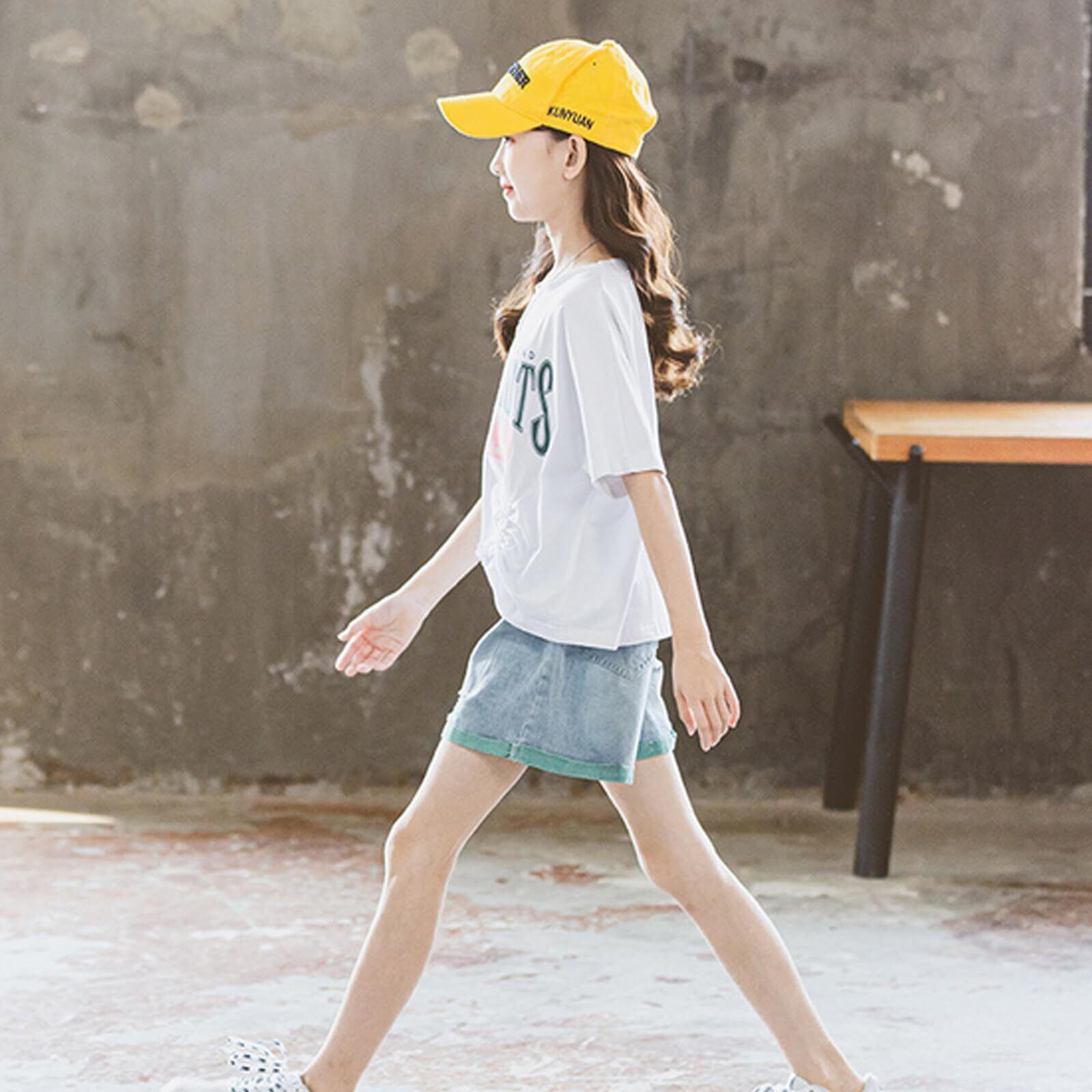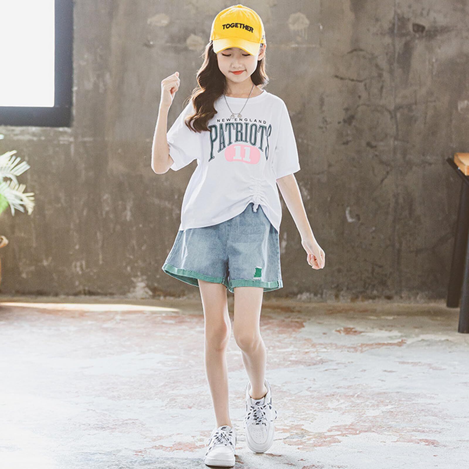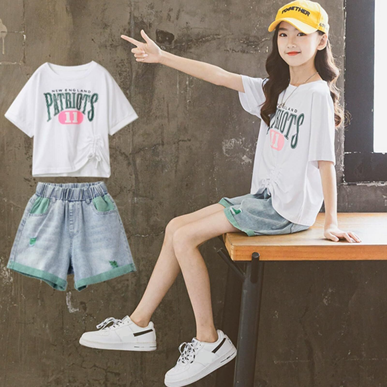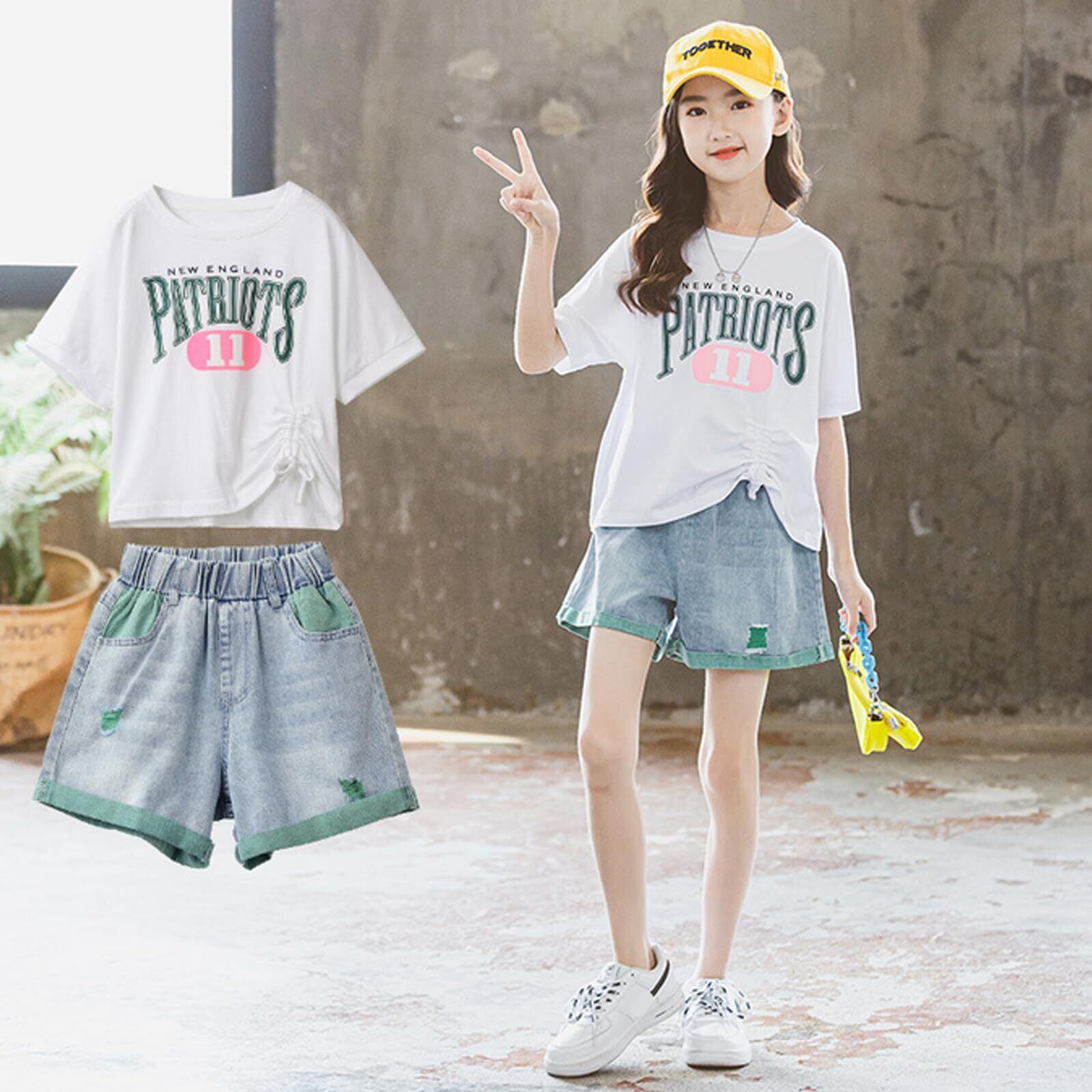 【数量限定】[Mskikefly] 子供服 夏 半袖 Tシャツ デニムハーフパンツ 上下セット キッズ 女の子用 韓国風セット コットン 小学生 中学生 子供 通学 日常 カジュアル | 無意味ステッカー