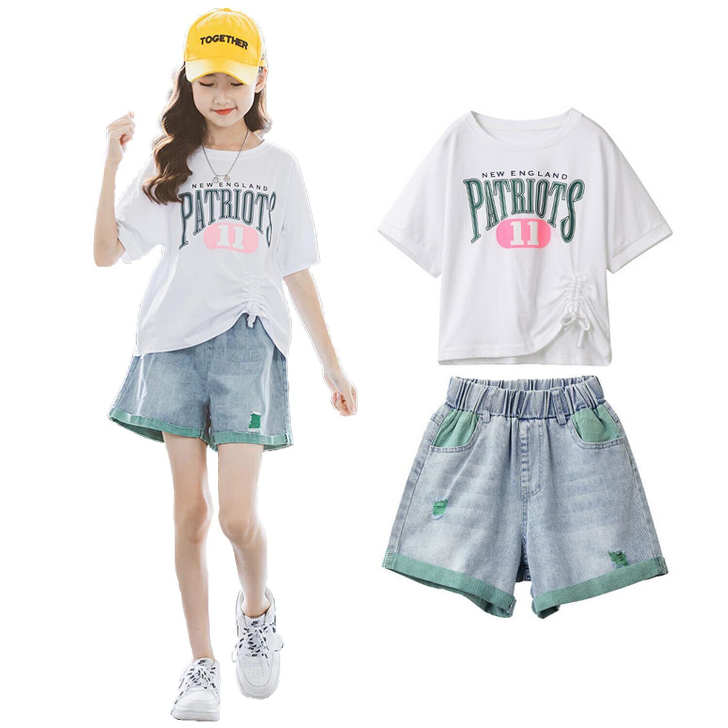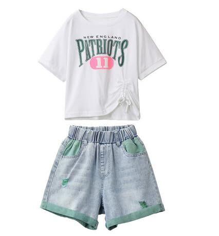 [Mskikefly] 子供服 夏 半袖 Tシャツ デニムハーフパンツ 上下セット キッズ 女の子用 韓国風セット コットン 小学生 中学生 子供 通学 日常 カジュアル