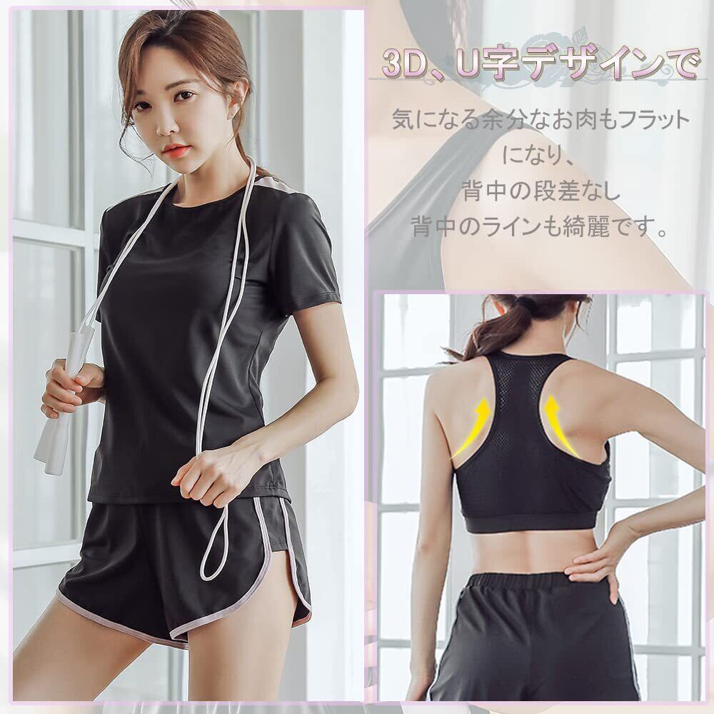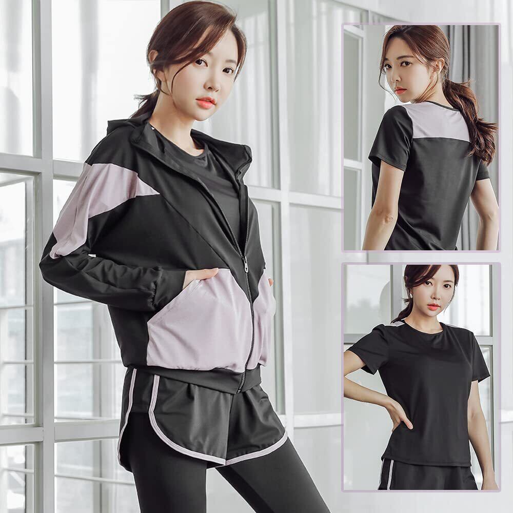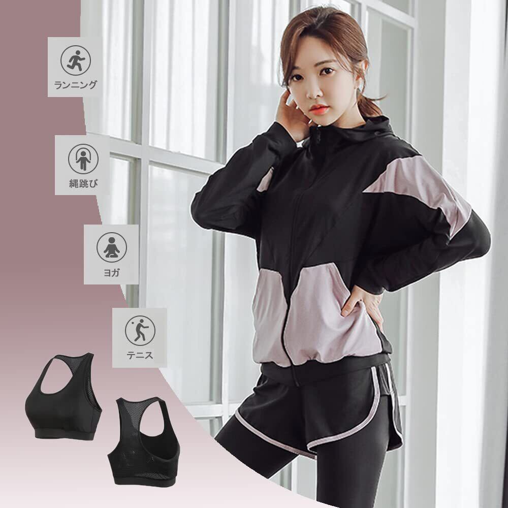 【5点セット】スポーツブラジャー&Tシャツ&スポーツパーカー&ハーフパンツ&タイツ 全て揃った上下5点セットのスポーツウエア!半袖と長袖、スポーツブラで数パターンの着こなしが可能で、様々なシーンを魅力的に演出します。自分の好みに合わせて様々な組み合わせることができる。春から冬までロングシーズンお使いいただける。