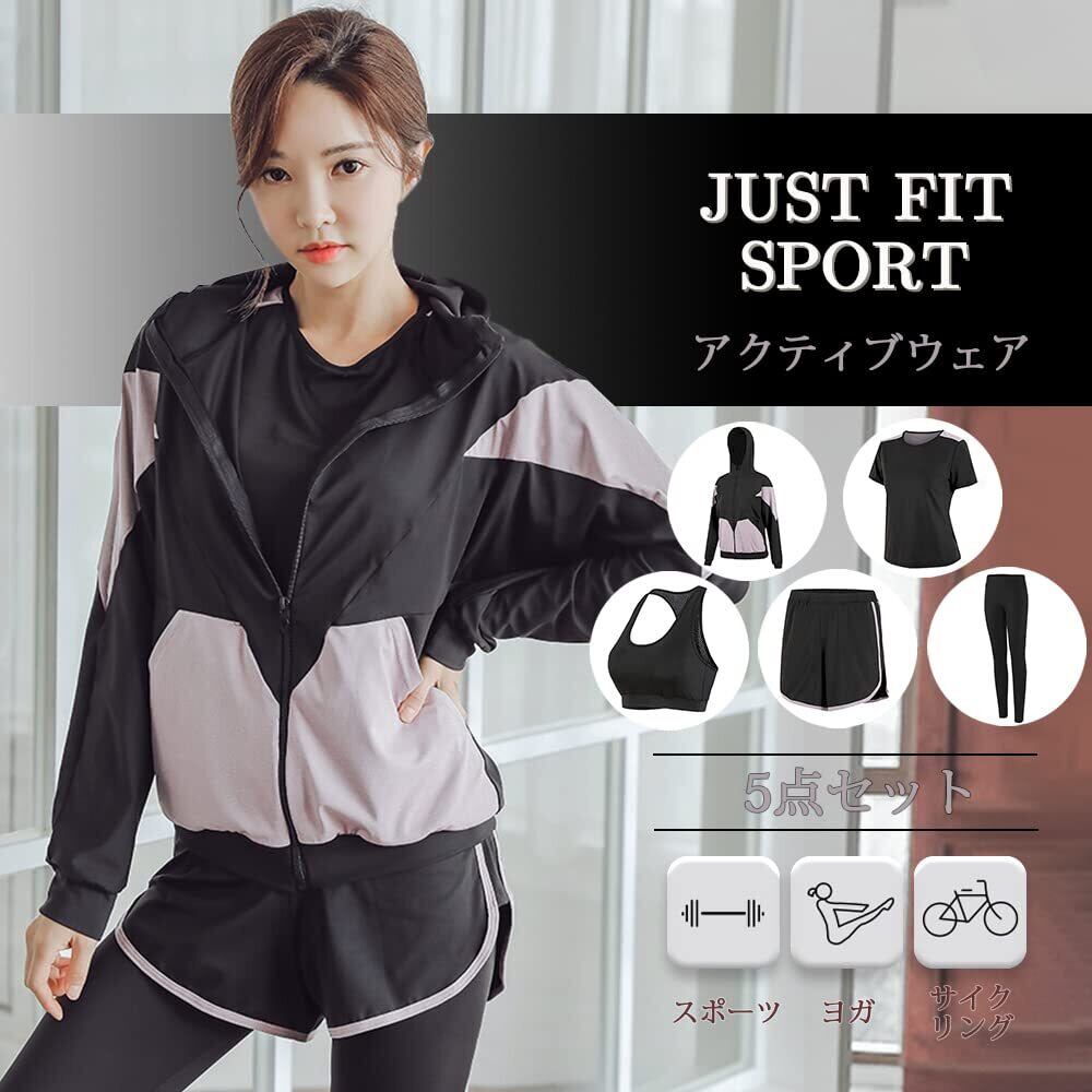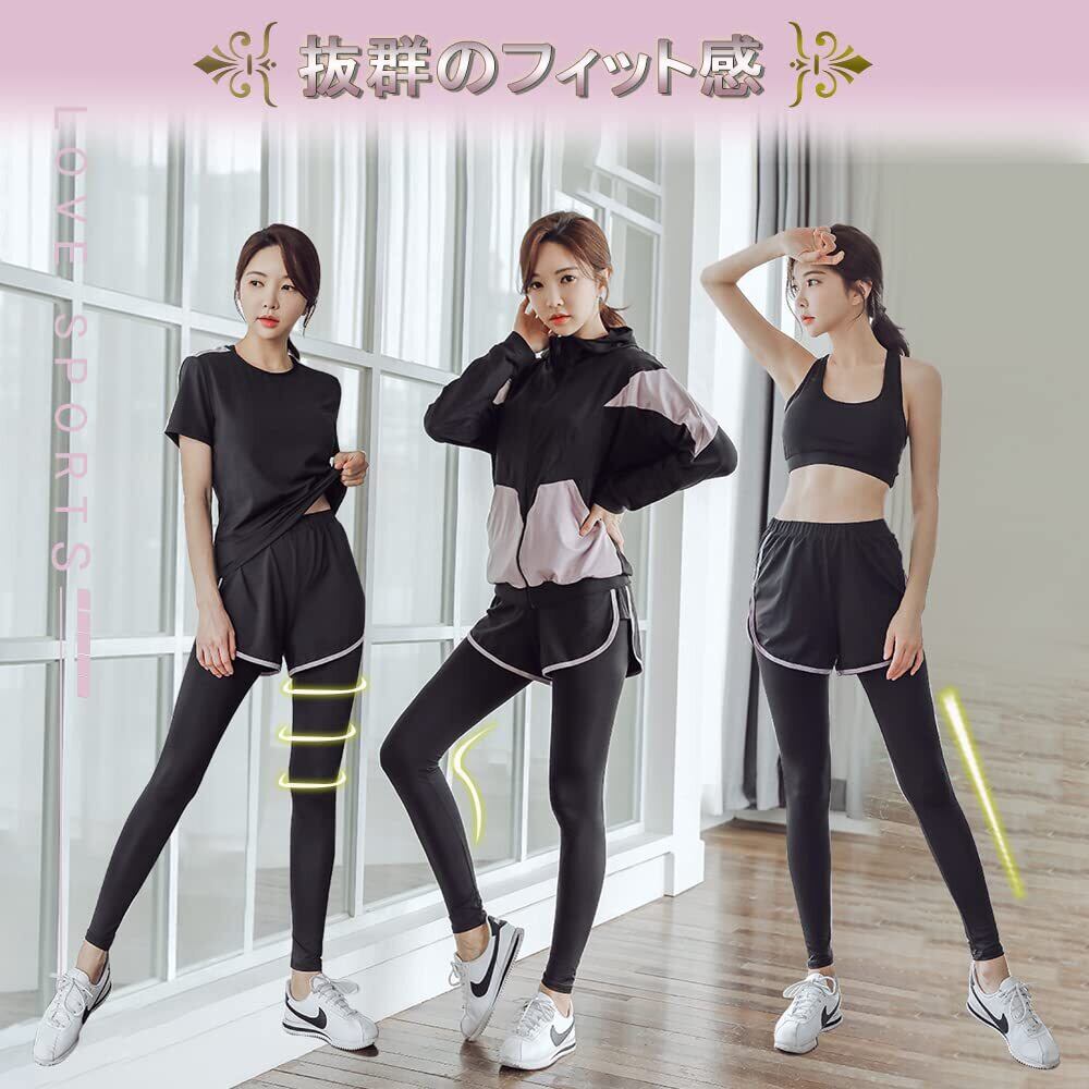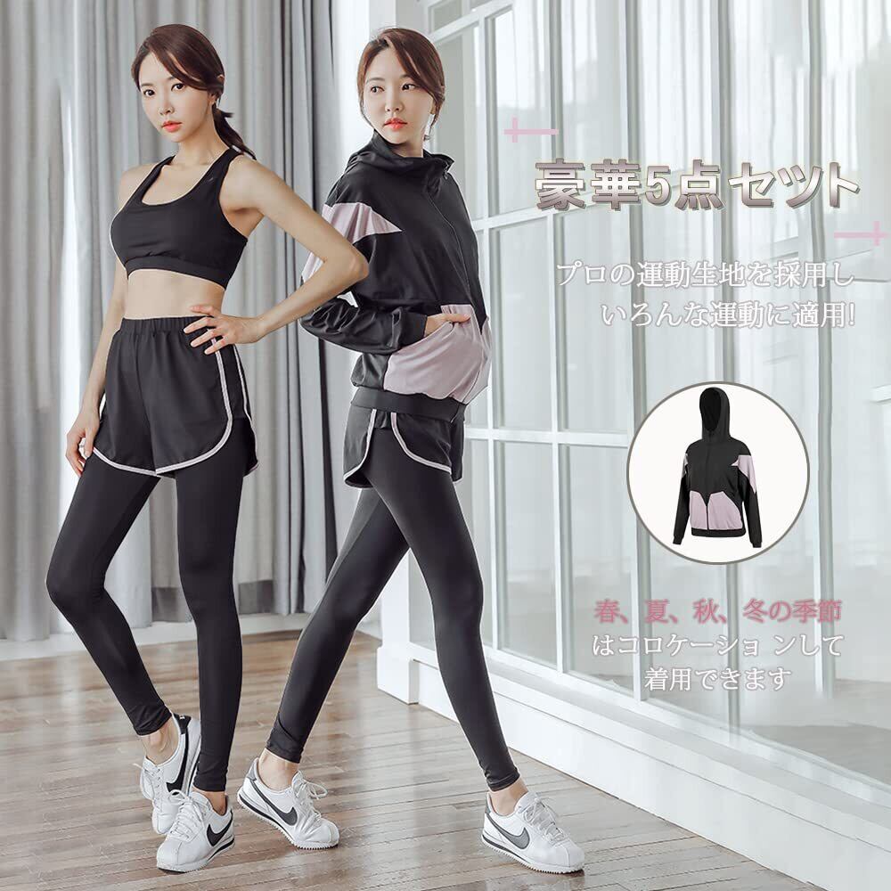 [DawnRain] スポーツウェア レディース ヨガウェア トレーニングウェア ランニングウェア 上下 5点セット 伸縮性 通気 吸汗速乾 フィットネス ジャージ スポーツブラ ロングタイツ パーカー 半袖 短パンツ 春夏秋冬