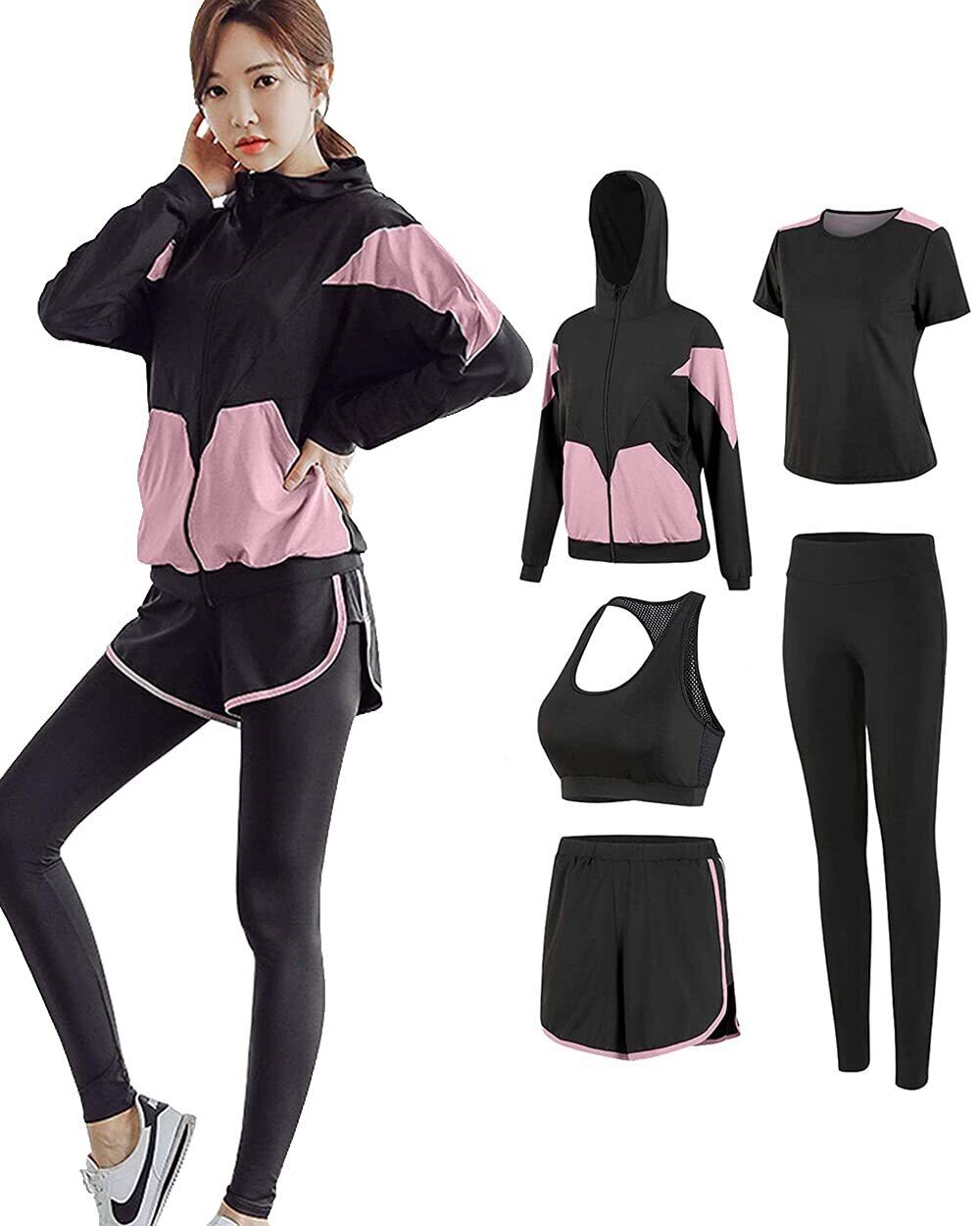 【2022最新】[DawnRain] スポーツウェア レディース ヨガウェア トレーニングウェア ランニングウェア 上下 5点セット 伸縮性 通気 吸汗速乾 フィットネス ジャージ スポーツブラ ロングタイツ パーカー 半袖 短パンツ 春夏秋冬 | 無意味ステッカー