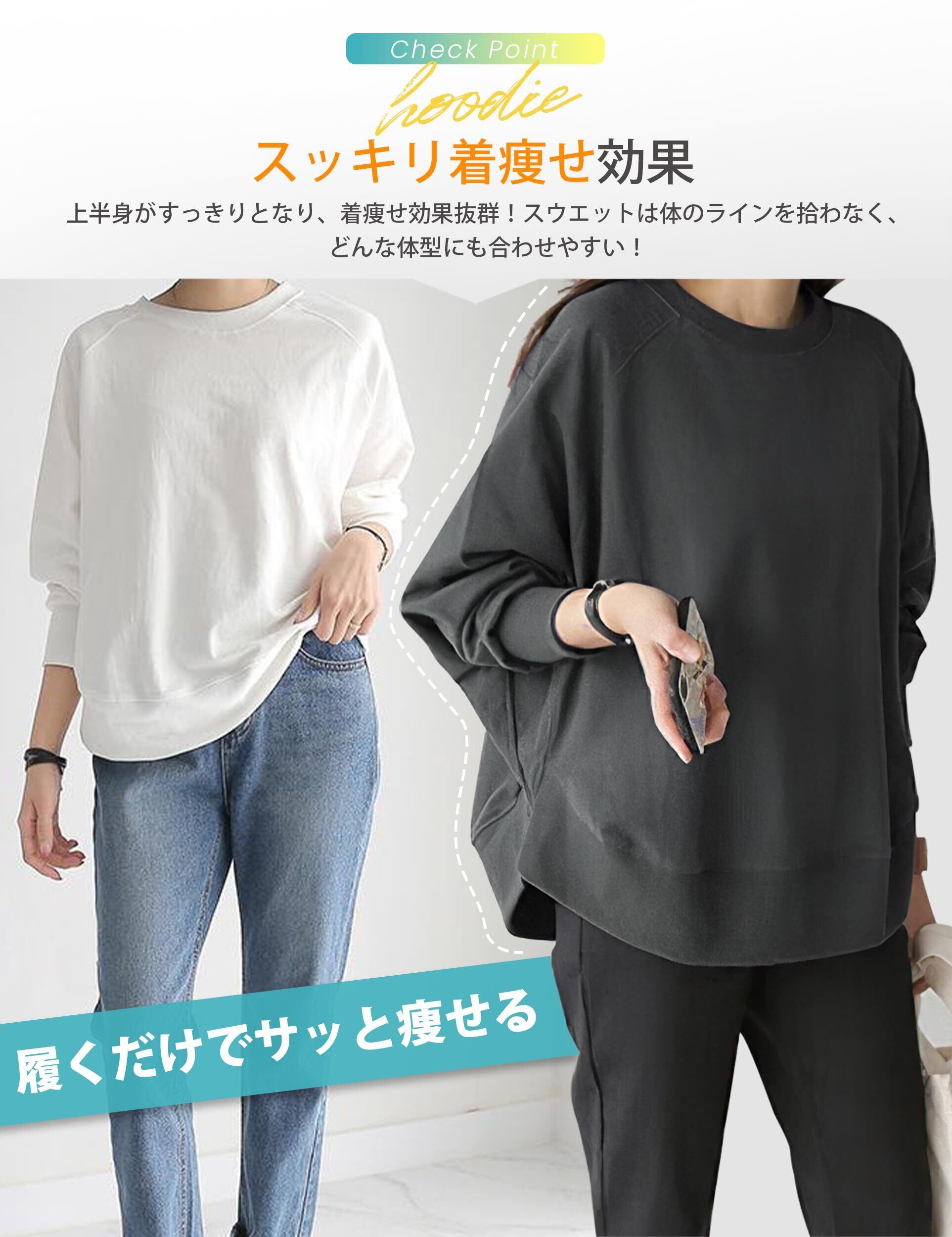 【 ゆったり体型カバー&着痩せ 】SLEEPSINEROのトレーナーレディースはゆとりのあるシルエットに仕上げており、二の腕・お腹・ヒップなど、気になる部分をしっかりカバーできます。ゆったりトレーナーを着るとバストのボリュームも目立ちにくくなり、着痩せ効果抜群! そのため、スウエットは体のラインを拾わなく、どんな体型にも合わせやすい!全体のバランスを整えると、上半身がすっきりとなり、メリハリのあるスタイリッシュな着こなしが叶います。