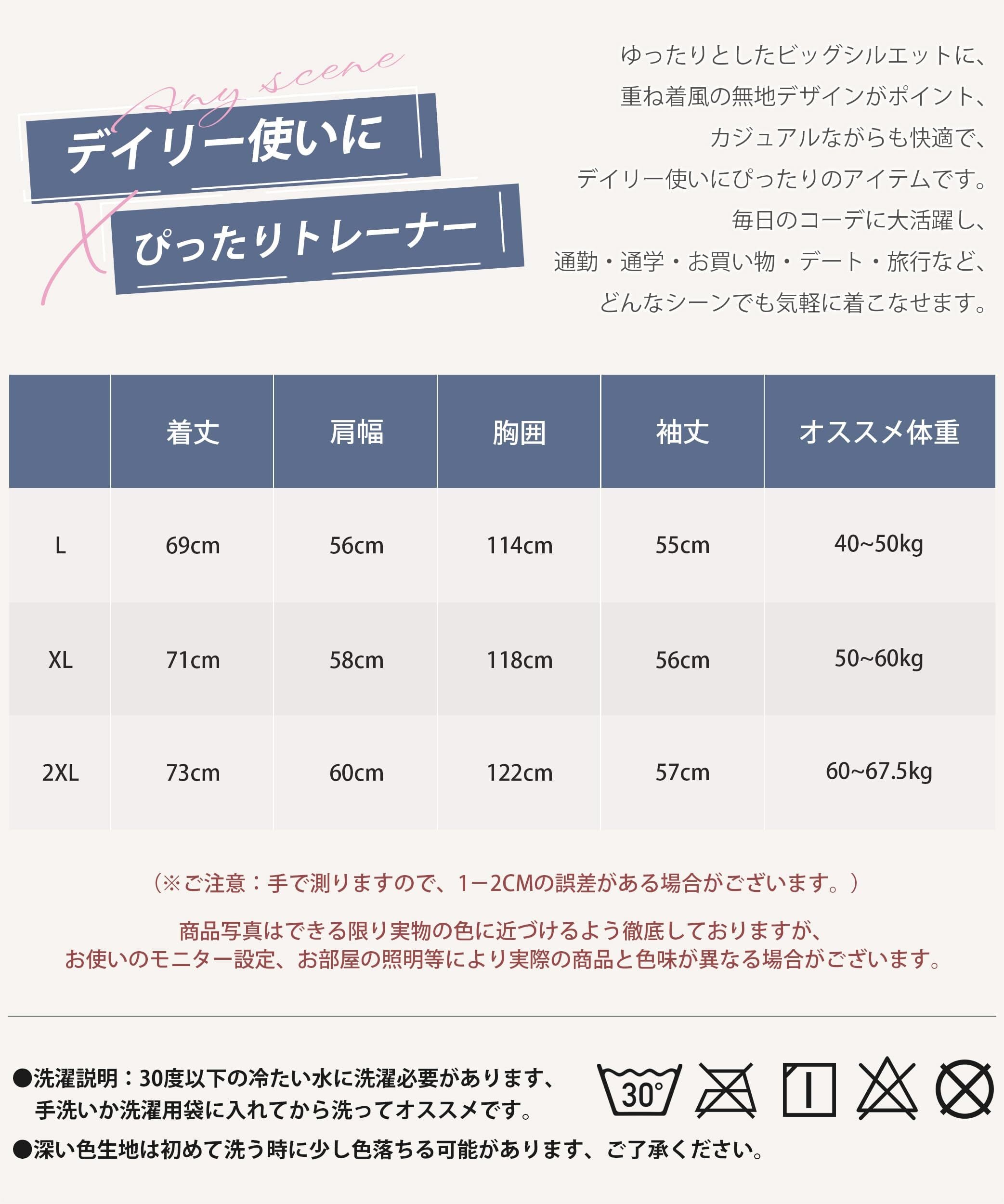【オーバーサイズ×着瘦せ】AOYのトレーナー レディースは体型をしっかりカバーしてくれるオーバーサイズデザインを採用し、気になる二の腕や肩まわり、お尻までを自然に覆い、ゆったりしていながらもだらしなく見えない絶妙なシルエットです。また、AOYのトレーナー レディースはゆるっと着られるのにスッキリ見える着瘦せ効果も抜群で、カジュアルとスタイルアップを両立し、まさに春秋に欠かせない万能トップスです。