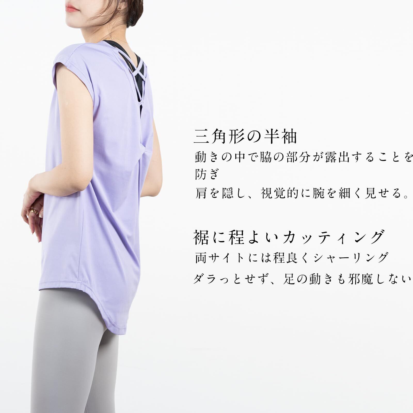 【小顔効果.着痩せ効果】小顔効果のあるボートネック。肩をさりげなく隠すキャップスリーブで二の腕細見え!裾が三角形のデザインので、サイドが脚が細く見えるようになっています。肩のデザインでヨガウェアは上が広く下が狭い。視覚的には背が高くてせているように見えます。