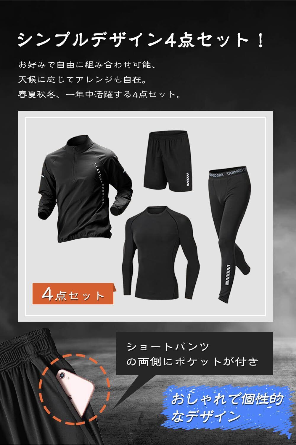 [ciciibear] コンプレッションウェア メンズ 長袖 4点セット スポーツウェア 上下セット トレーニングウェア ウォーキング サイクリング ジム 筋トレ 吸汗速乾 通気