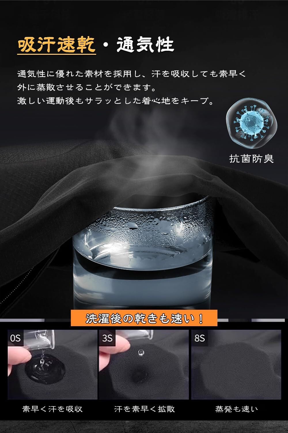 【爽快なドライ感で、運動も快適に】抜群の吸汗速乾性を備えた通気素材を採用。汗を素早く吸収し、抗菌防臭効果を発揮しながら湿気を迅速に排出します。激しい運動の後でも、清涼で快適な着心地をキープ。思いきり運動に没頭できるようサポートします。