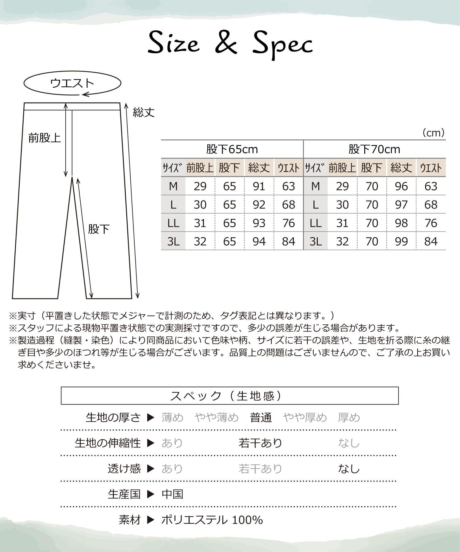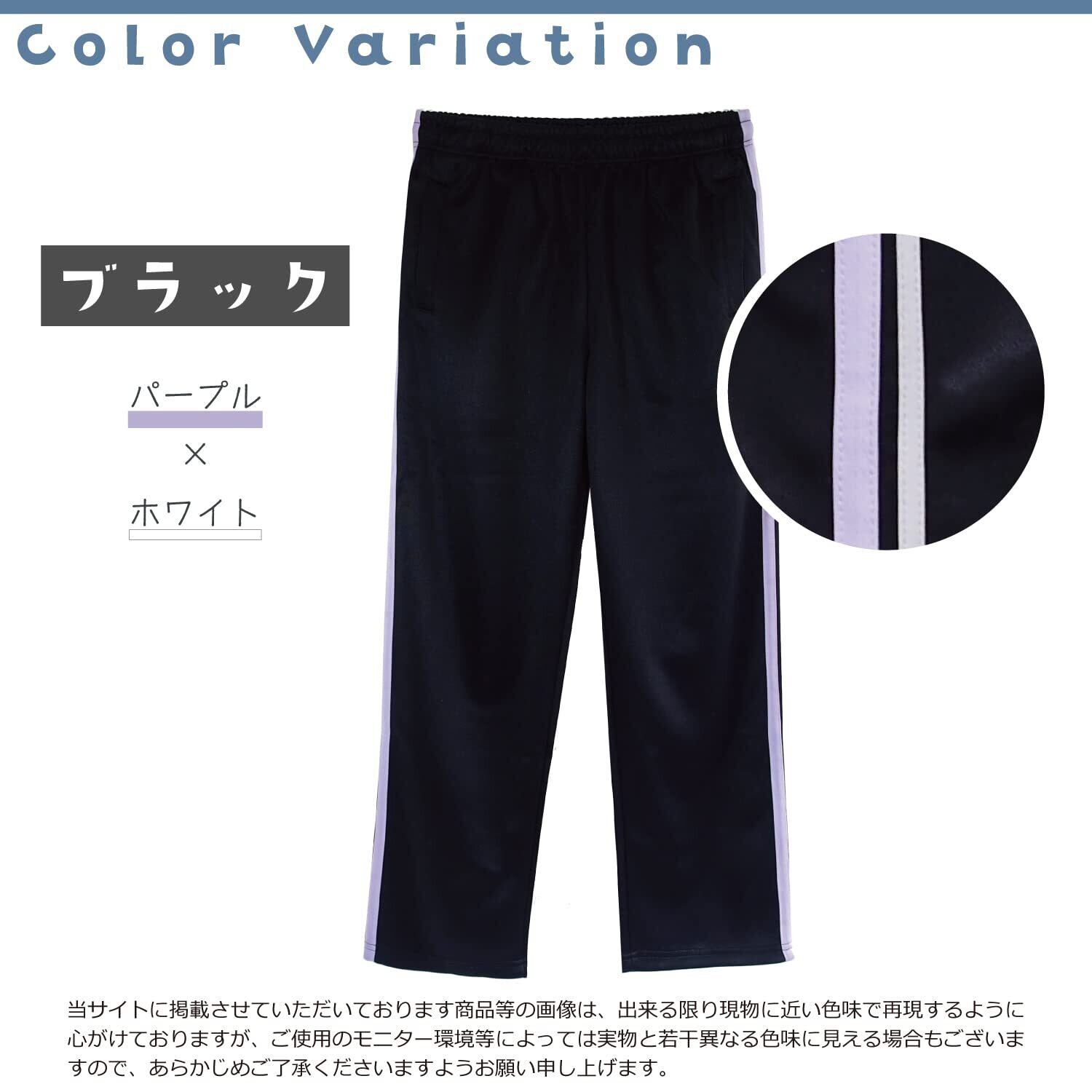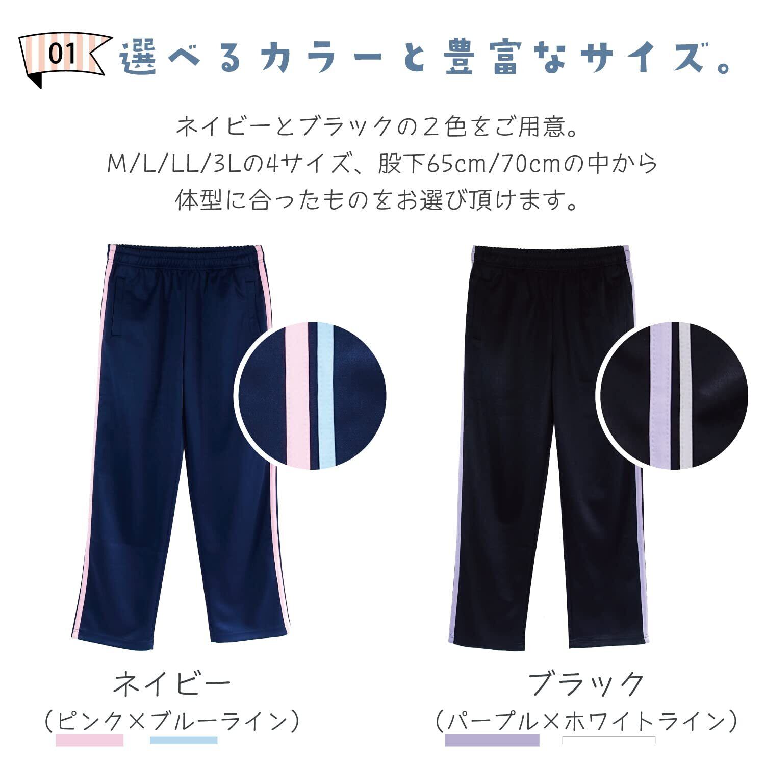 【選べるカラーと豊富なサイズ】ネイビーとブラックの2色をご用意。M/L/LL/3Lの4サイズ、股下65cm/70cmの中から、体型に合ったものをお選びいただけます。ネイビーにはピンク×ブルーのライン、ブラックにはパープル×ホワイトのラインがサイドに入っています。
