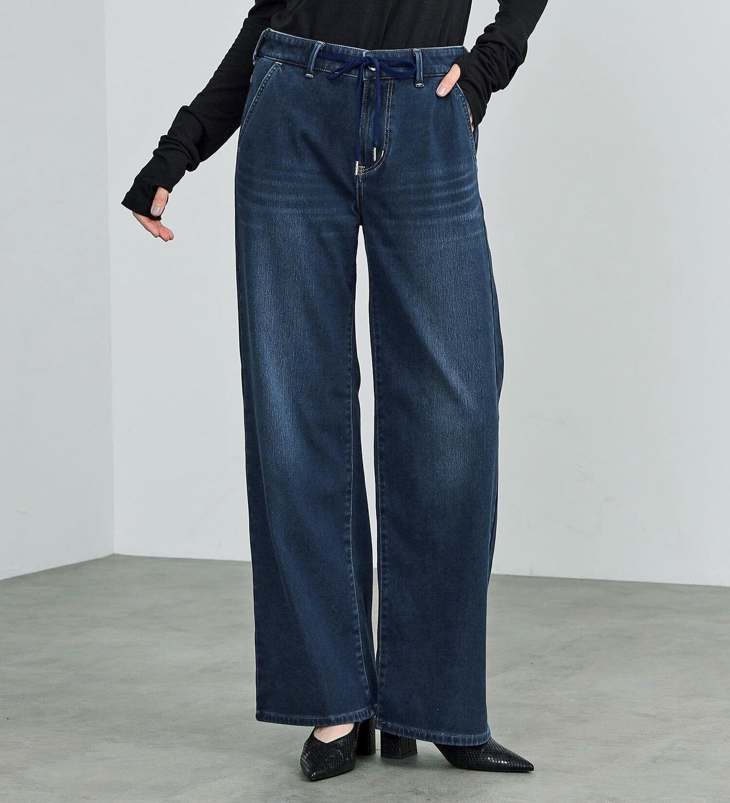 細すぎず、太すぎず、裾に向かってストンと落ちる脚長効果抜群のワイドシルエット。ウエスト紐のイージーパンツ仕様。紐は取り外し可能。紐を取り外しても、ベルトループで紐を通す穴が隠れるようにデザインしているので、見た目の違和感なくご着用いただけます。