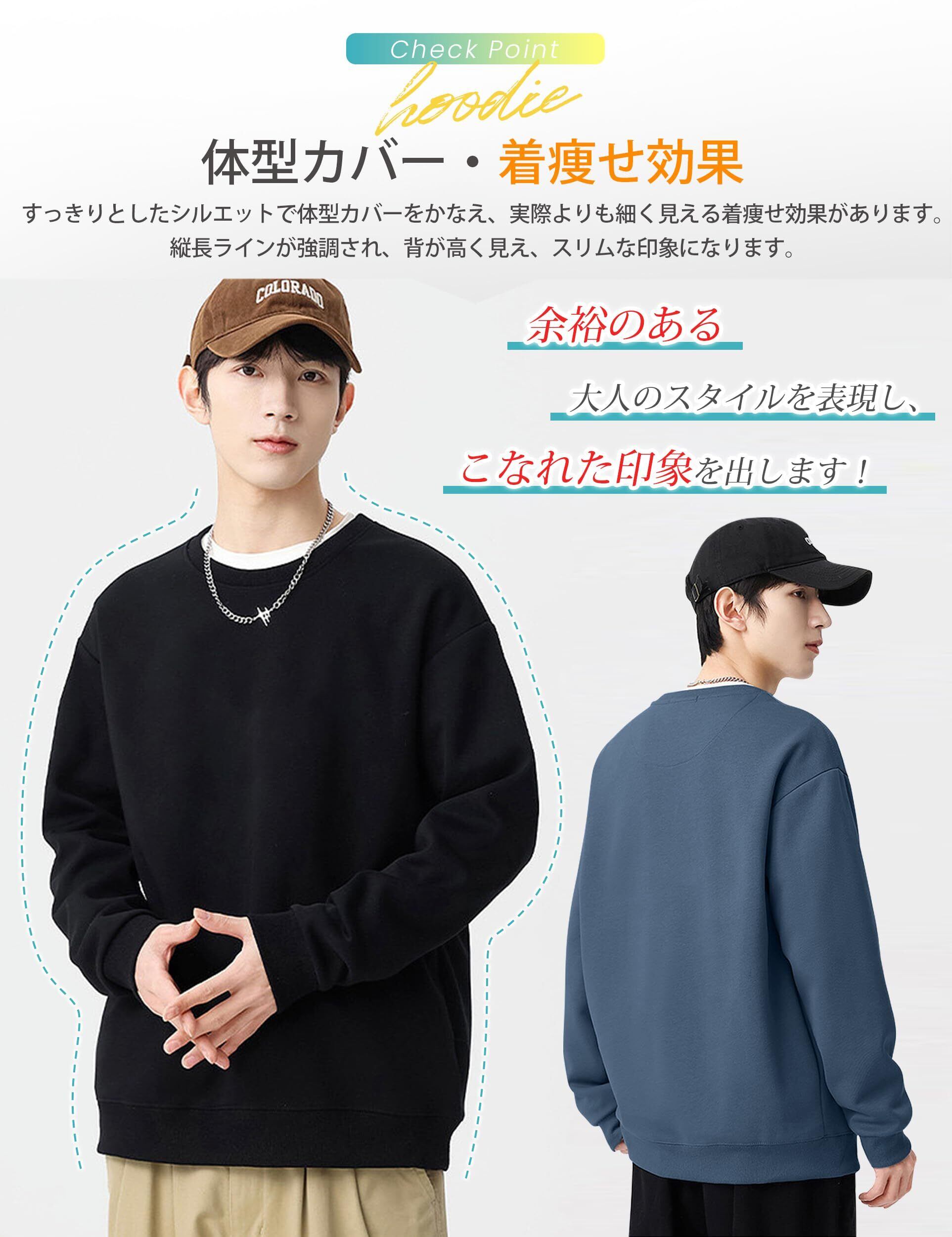✨【ゆったり体型カバー・着痩せ!】トレーナーメンズはすっきりとしたシルエットで体型カバーをかなえ、実際よりも細く見える着痩せ効果があります。縦長ラインが強調され、背が高く見え、スリムな印象になります。メンズスウェットを着るだけで体型カバーを実現、余裕のある大人のスタイルを表現し、こなれた印象を出します!シンプルなデザインで、清潔感があり、程よい抜け感を演出します。また、ゆったりとしたシルエットで窮屈感なく着用でき、動きを邪魔しません。大人のカジュアルスタイルにぴったりの大きいサイズトレーナーです!