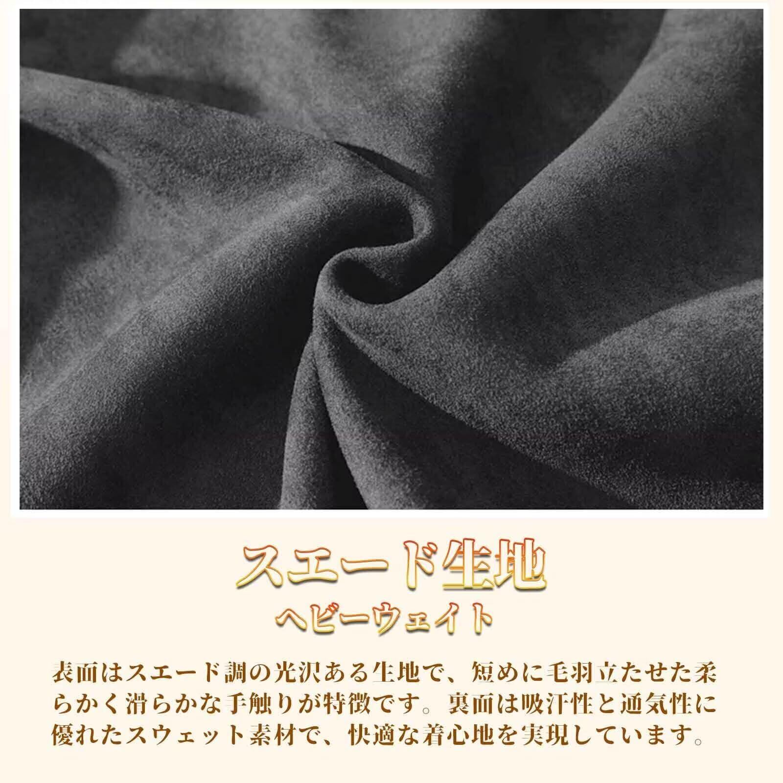 【スエード表地&スウェット裏地】表面はスエード調の光沢ある生地で、短めに毛羽立たせた柔らかく滑らかな手触りが特徴です。裏面は吸汗性と通気性に優れたスウェット素材で、快適な着心地を実現し、静電気対策とほどよい伸縮性も備えています。