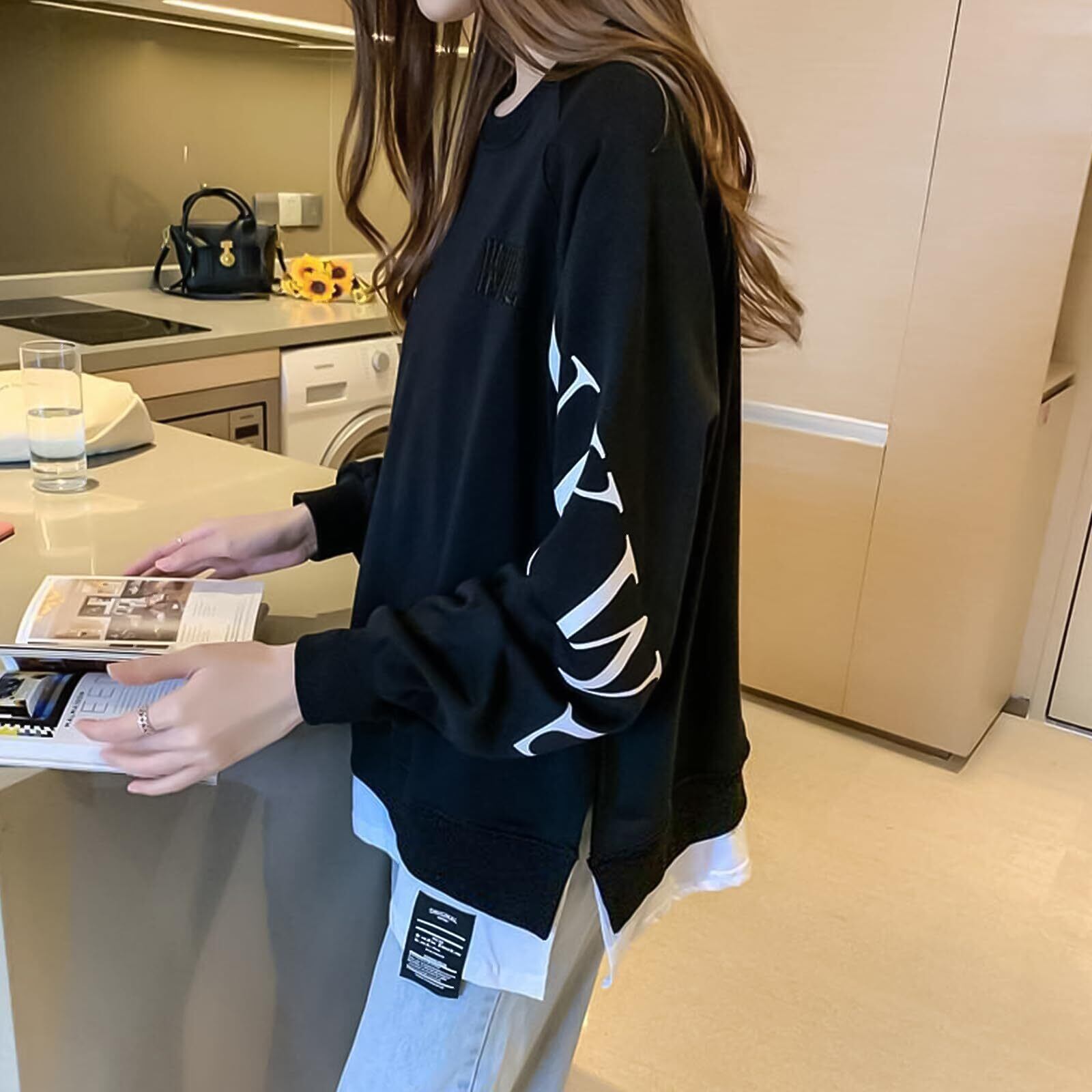 【特価商品】[SeiunAn] トレーナー レディース ロンT スウェット 長袖 薄手 秋 冬 プルオーバー 春 トップス レイヤード 重ね着風 切り替え スリット入り 英字プリント ロゴ 長袖tシャツ フェイクツーピース ゆったり 大きいサイズ おしゃれ 韓国 | 無意味ステッカー