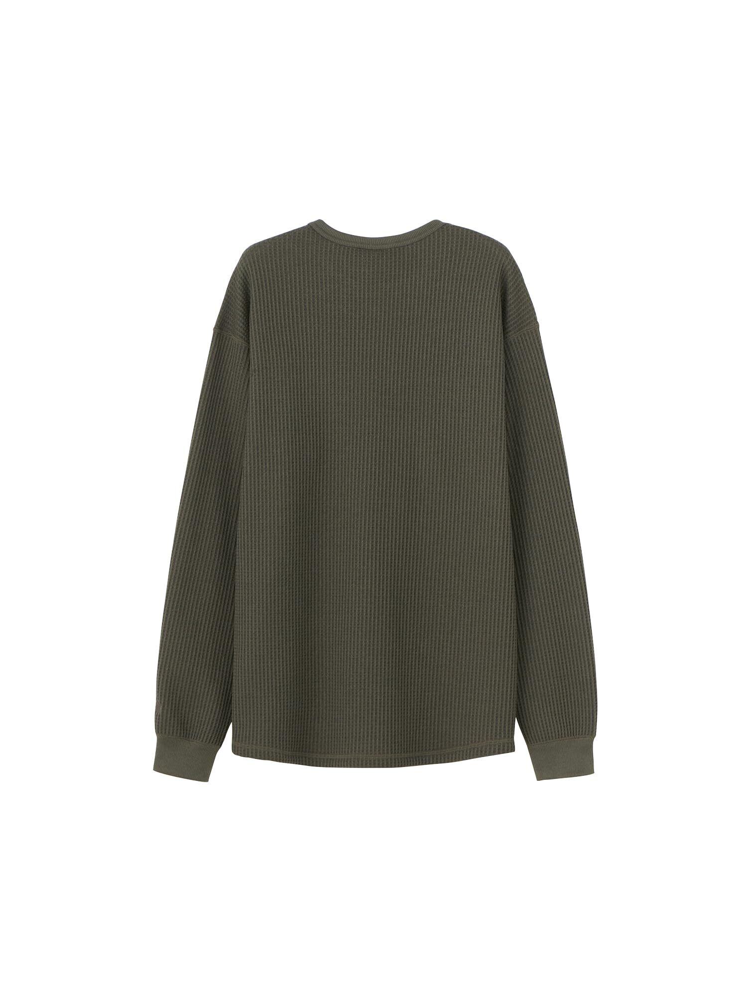肌寒い時期に重宝する、クルーネックの長袖シャツ。サイズ感をアップデートしています。凹凸のあるワッフル生地特有の通気のよさが特徴で、生地と体の間に空気の層を作り出し体温を逃がしにくいため、暖かさも確保。肌面に起毛を施すことで柔らかな肌触りとしなやかな着心地を追求しています。リサイクルポリエステルとポリウレタンを混紡した生地は適度なストレッチ性を備え、洗濯もしやすいイージーケア。リラックスタイムにも心地よく着用できる、ゆとりのあるシルエットに仕上げています。