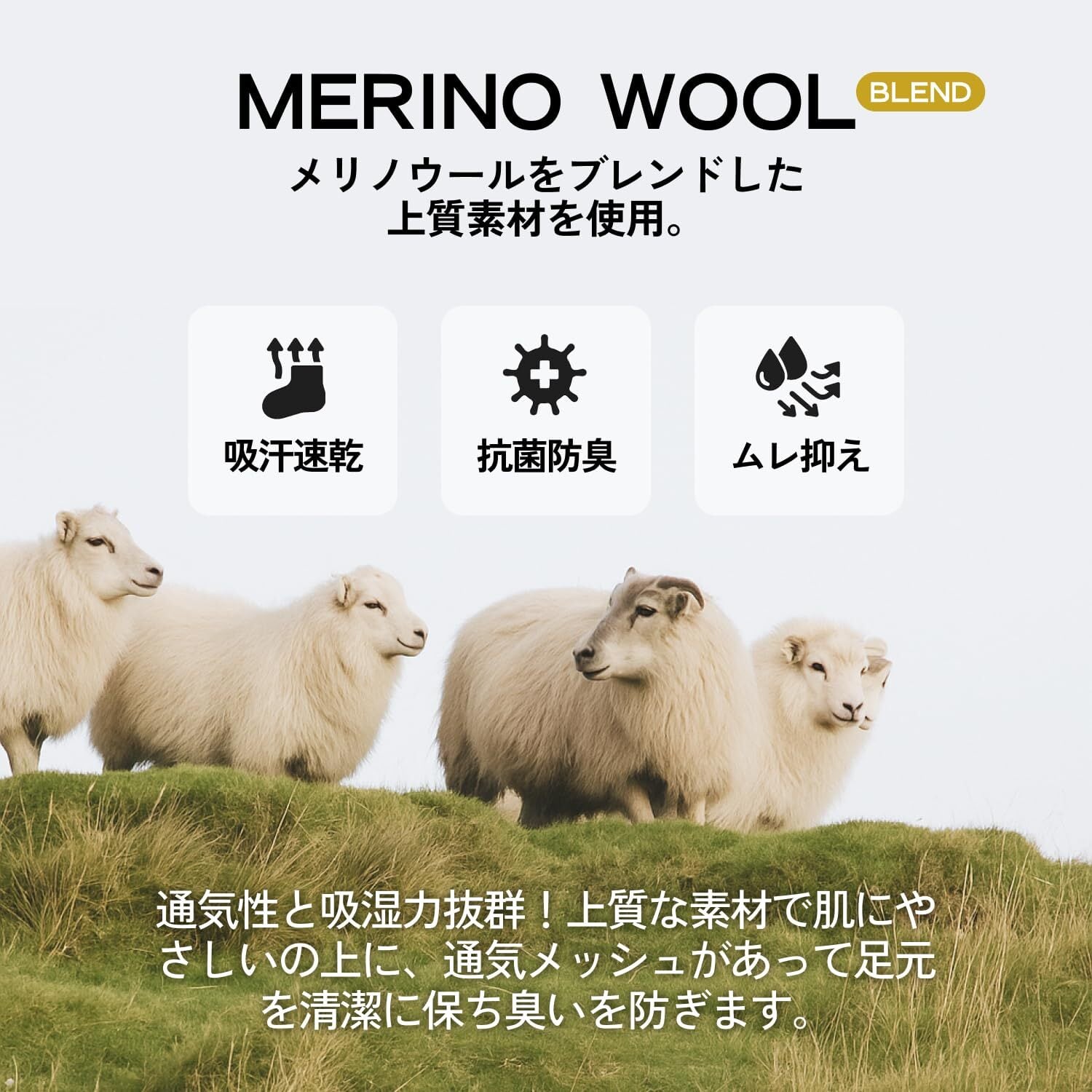 【消臭・吸水速乾】吸放湿性と消臭機能に優れたメリノウールは汗によるムレや臭いを軽減し快適な履き心地を提供。機能性と快適性を両立したソックスです。