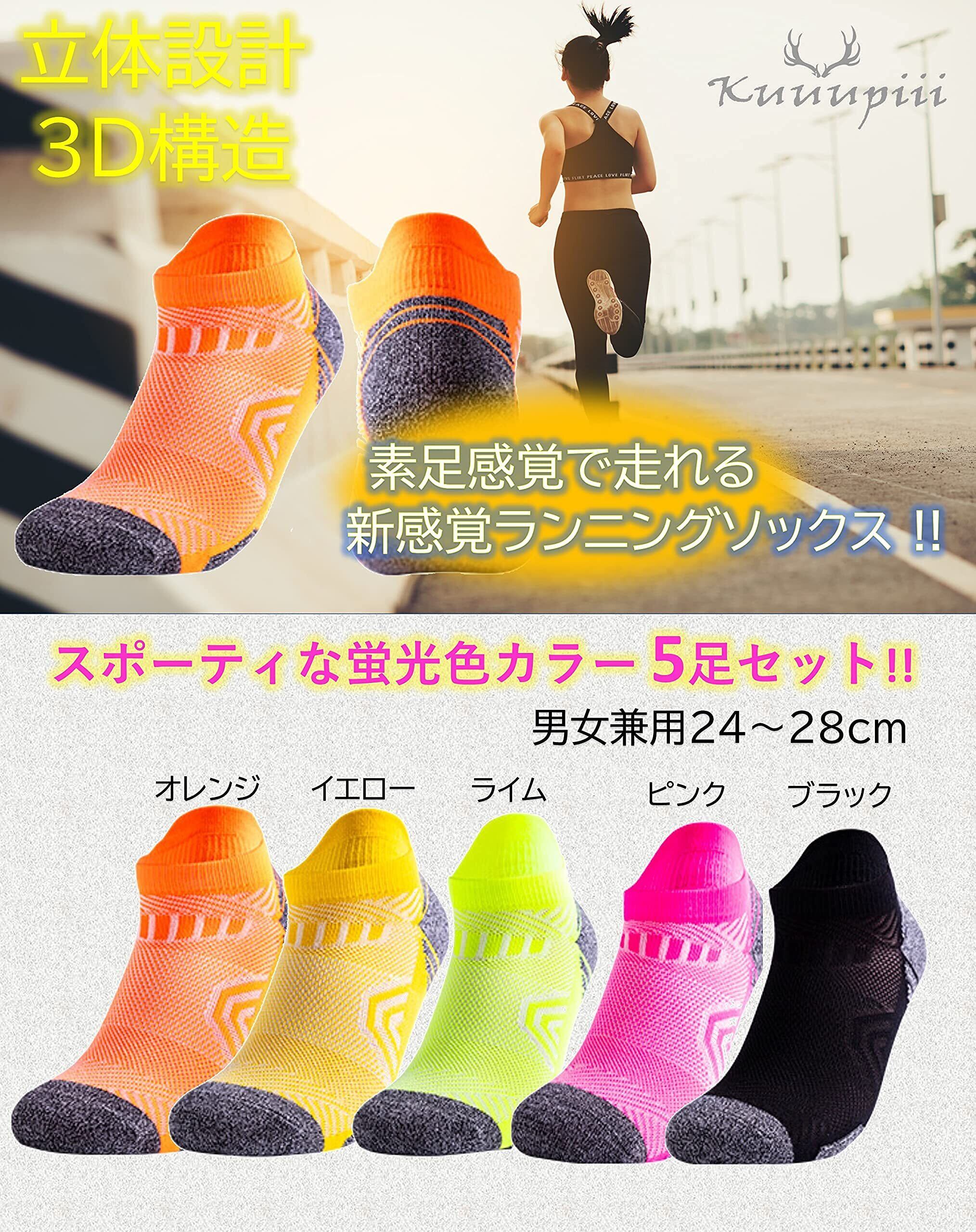 【kuuupiiiランニングソックスの特徴①】立体設3D構造+新特殊ナイロン素材で今までにないフィット感を実現 伸縮性が良いため24~28cmと幅広いサイズ対応を可能にし、男女兼用にて幅広い方々にご着用いただけます。