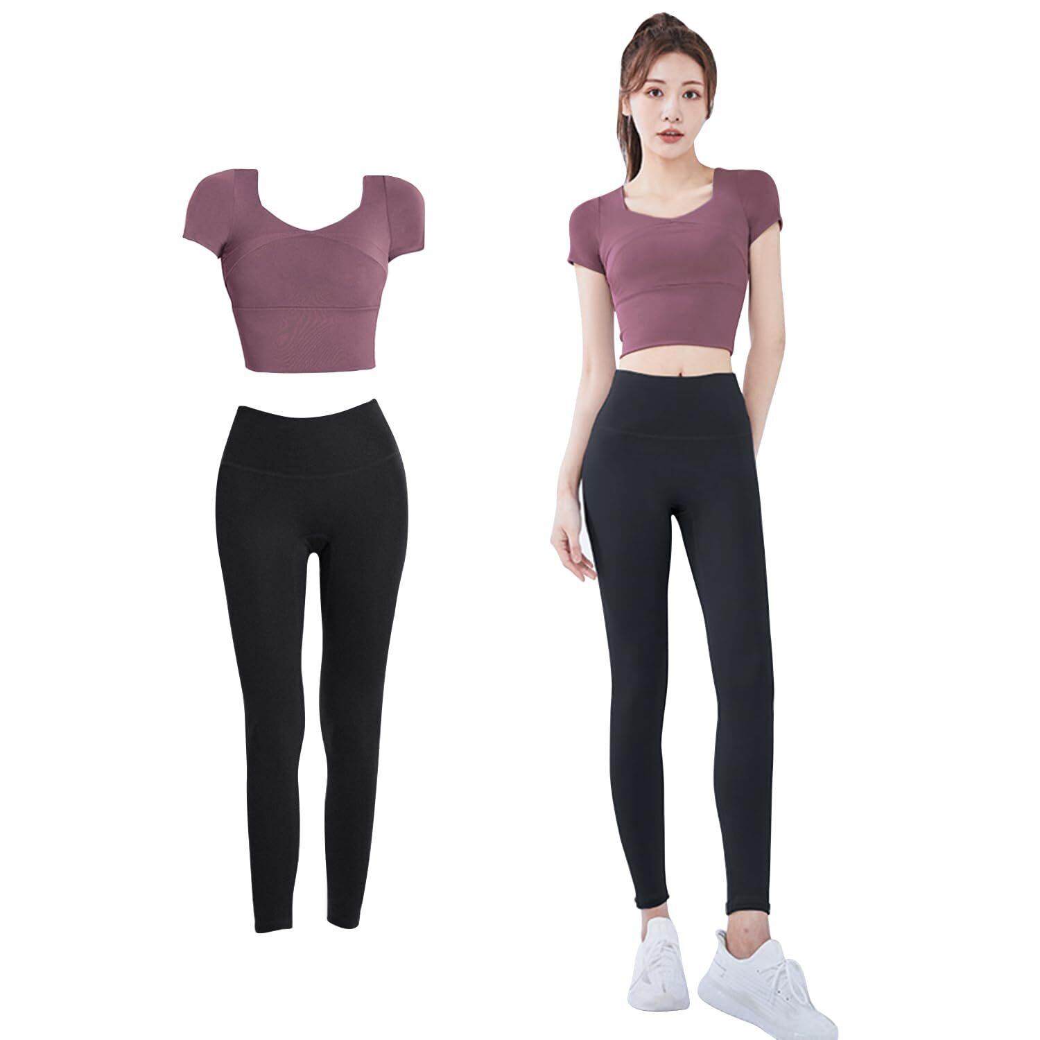 【スポーツウェア2点セット】ショート丈の半袖トップスとブラックヨガパンツを組み合わせた2点セットです。吸汗速乾性、通気性、伸縮性に優れたスポーツ専用素材を採用し、汗を瞬時に吸収・発散させることで、着用時の不快感を軽減、サラッとした質感で気持ちよい着心地で運動に最適です。3D縫製技術を採用で体のラインピッタリとフィットし、自由な動きにサポートします。
