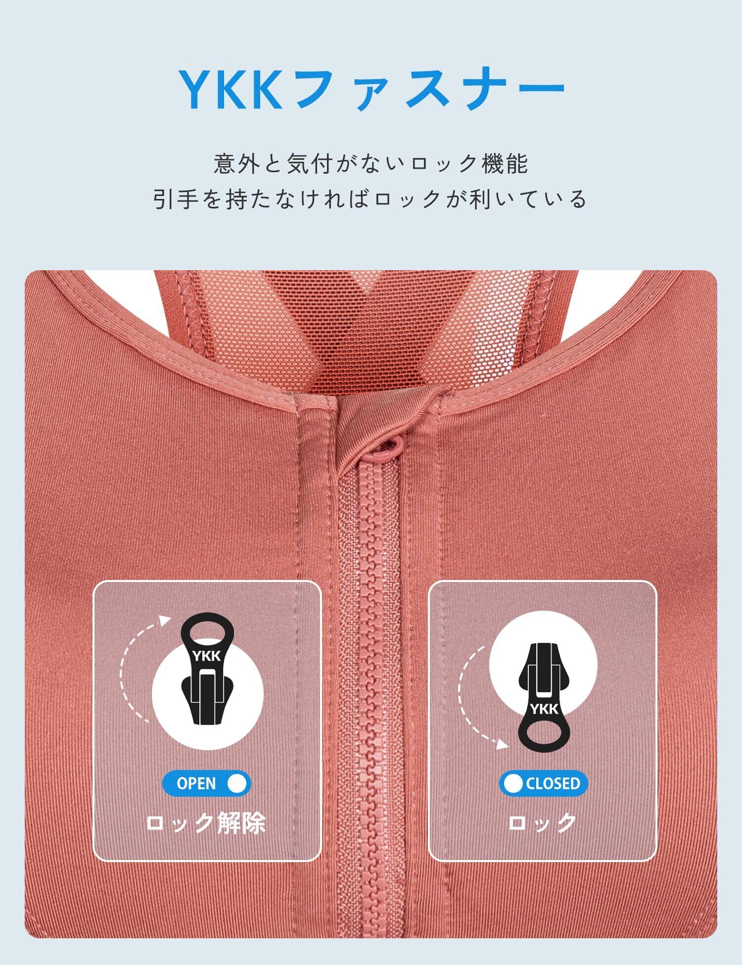 【前開きデザイン】前開きのデザインで、運動後も汗をかいた状態でも簡単に脱ぎ着できます。YKKの自己ロックファスナーを使用しており、運動中でもファスナーが緩むことはありません。