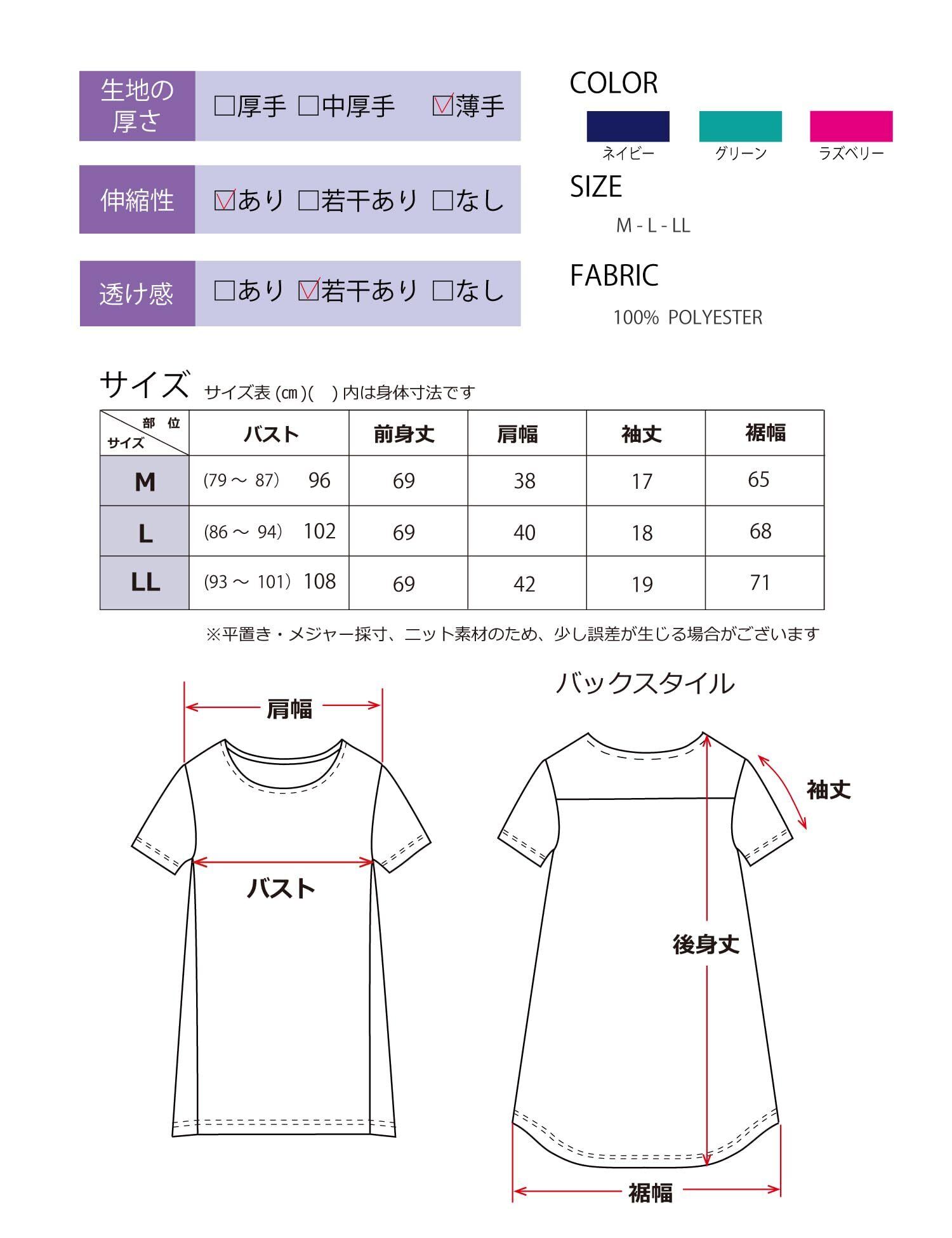 【Mサイズ】バスト96cm:肩幅38cm:袖丈17cm:身丈前/後ろ69/77cm 【Lサイズ】バスト102cm:肩幅40cm:袖丈18cm:身丈前/後ろ69/77cm 【LLサイズ】バスト108cm:肩幅42cm:袖丈19cm:身丈前/後ろ69/77cm