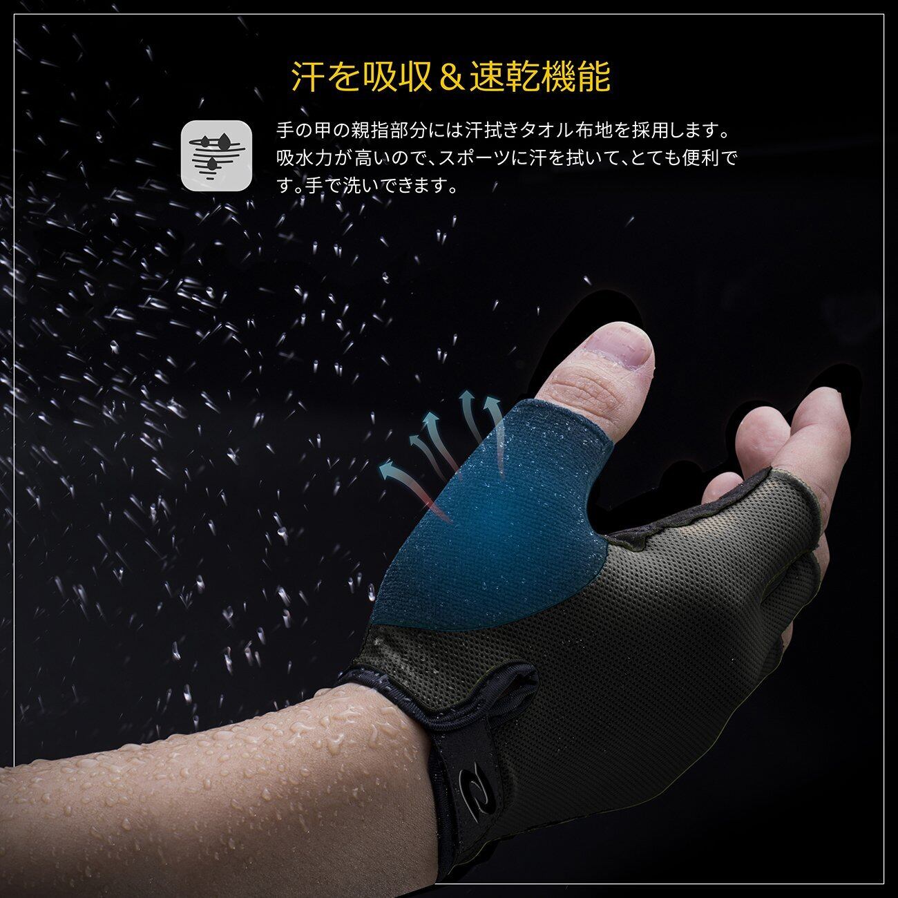 手のひら部分には耐摩耗性が高いポリウレタン素材を採用しており、張りが強く裂けにくく、丈夫で長持ちできます。手のひらにスポンジが追加され、振動や衝撃を和らげる効果も期待でき、手をしっかり守ります。さらに、良い伸縮性を持ち、指の動きを妨げなくスポーツシーンにもストレスなくお使いいただけます。手の甲に吸湿性と通気性が高くて柔らかいライカ生地をを採用しており、手の汗がかいても素早く吸収し乾燥させます。指と手首には通気穴があり、グローブ内の蒸れを防ぎ、いつでもドライで快適に保ています。さらに、肌触りが優れていて、快適な使い心地を実現します。手首部分にはマジックテープが付いていて、腕によって自由に調整できるのみならず、着脱にも楽々に行います。さらに、グローブは人間工学に基づいて設計され、ハンドルを握りやすいように、各指ごとに角度を変えて手の力を抜いた自然な指の曲がり方を再現しました。