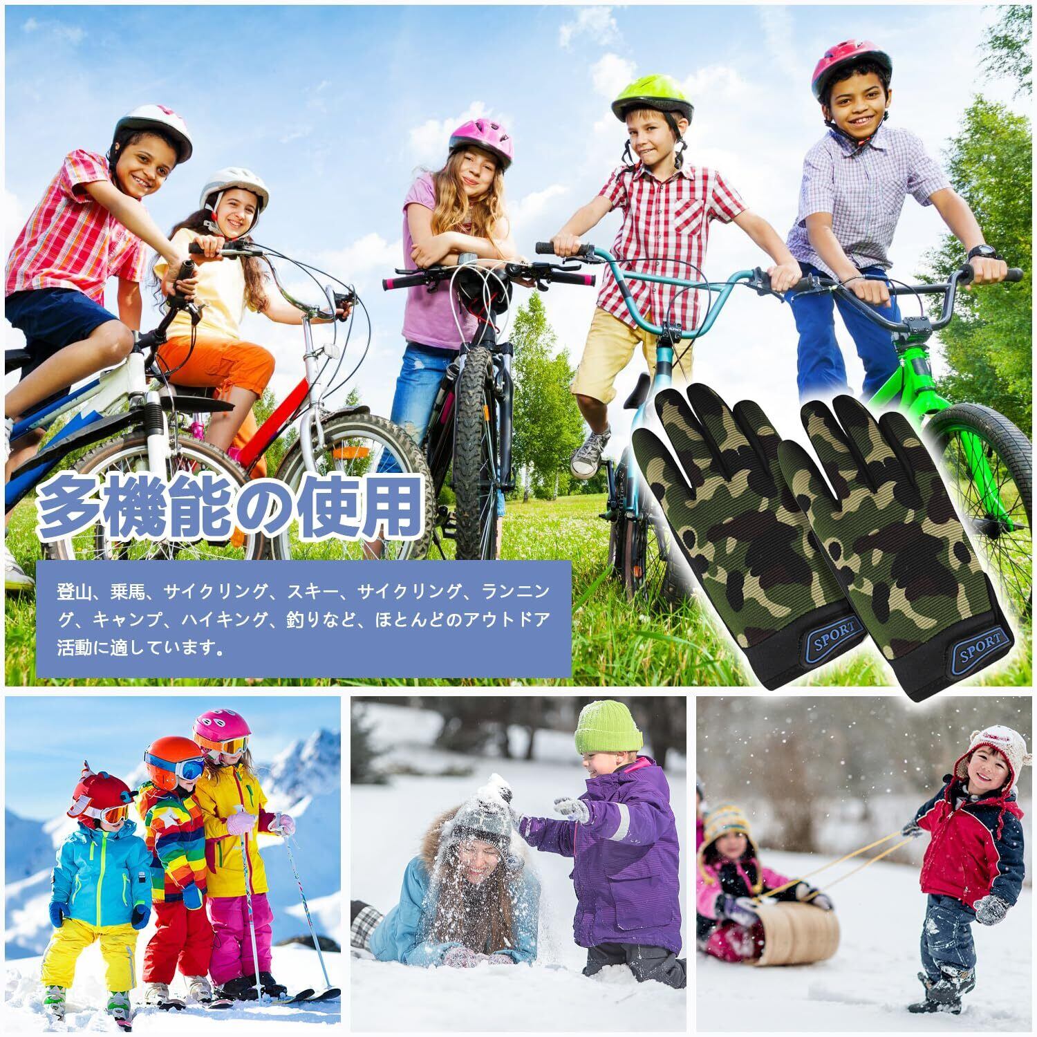 【使用範囲】この滑り止め手袋は、5~14歳の子供に適しており、一年中使用できます。自転車/バイクに乗る、乗馬、釣り、野球、ハイキング、登山、ランニング、スキー、スノーボードなどのアウトドアスポーツに大活躍そうです。ご購入をお待ちしております。