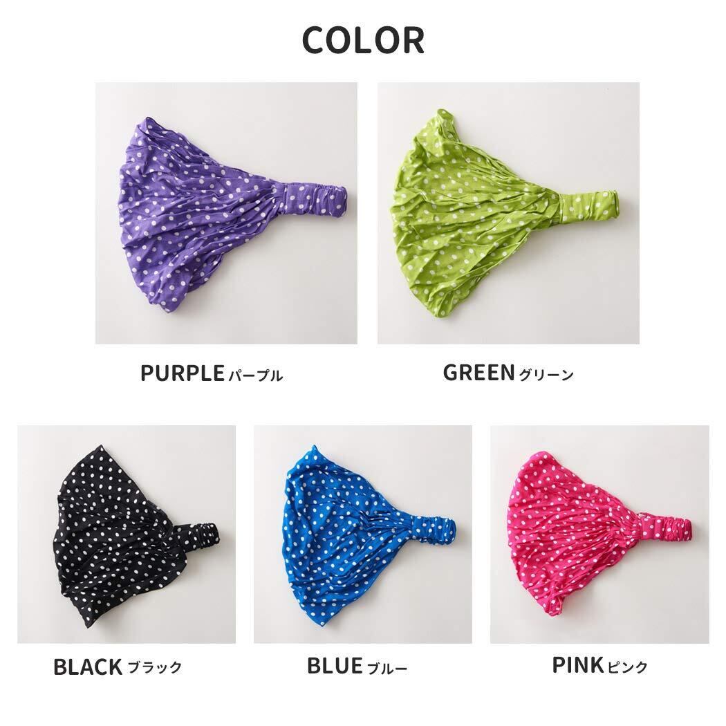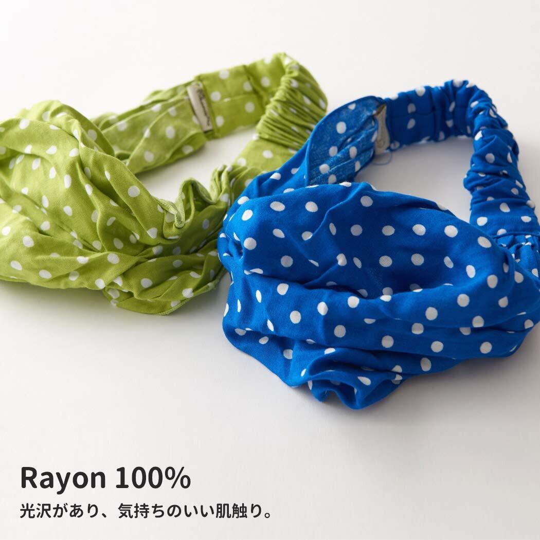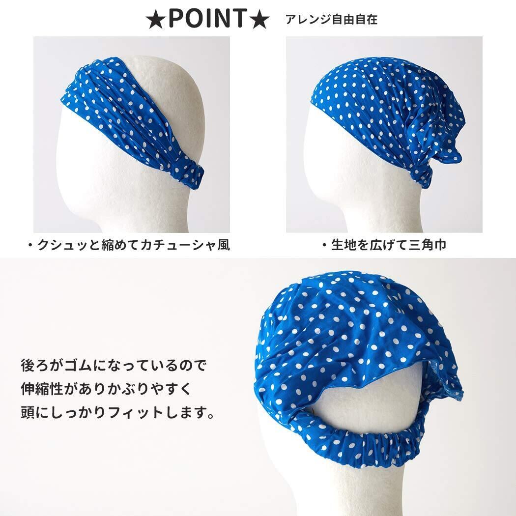 広げてかぶれば三角巾の様にすっぽりと頭を覆えて日よけにもなります。カチューシャのようにもなり前髪が目に入るのを予防してくれます。