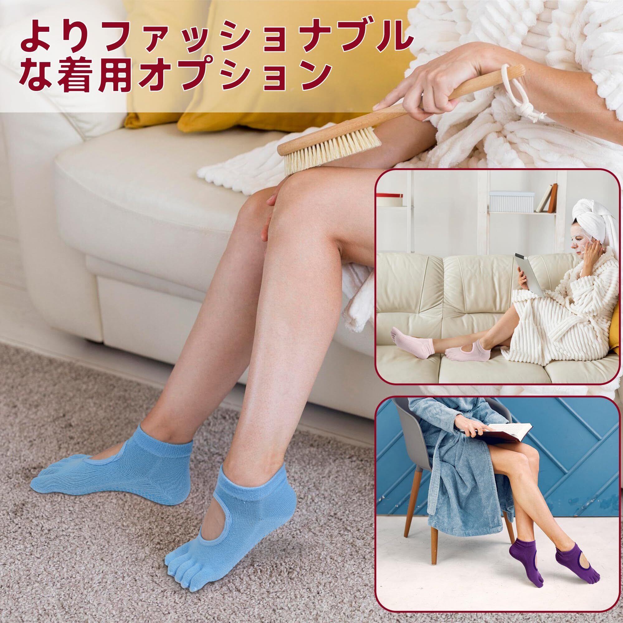 「足の保護」 ヨガつま先ソックスにはPVC粒子が取り付けられており、耐衝撃性と滑り止め効果があります。 足の安定性、トラクション、バランスを向上させ、足を怪我から守ります。5本指のスプリット・トゥ・デザインにより、つま先が自然に動き、伸びる。 自宅、トレーニング、旅行、スタジオ、病院での使用に最適です。