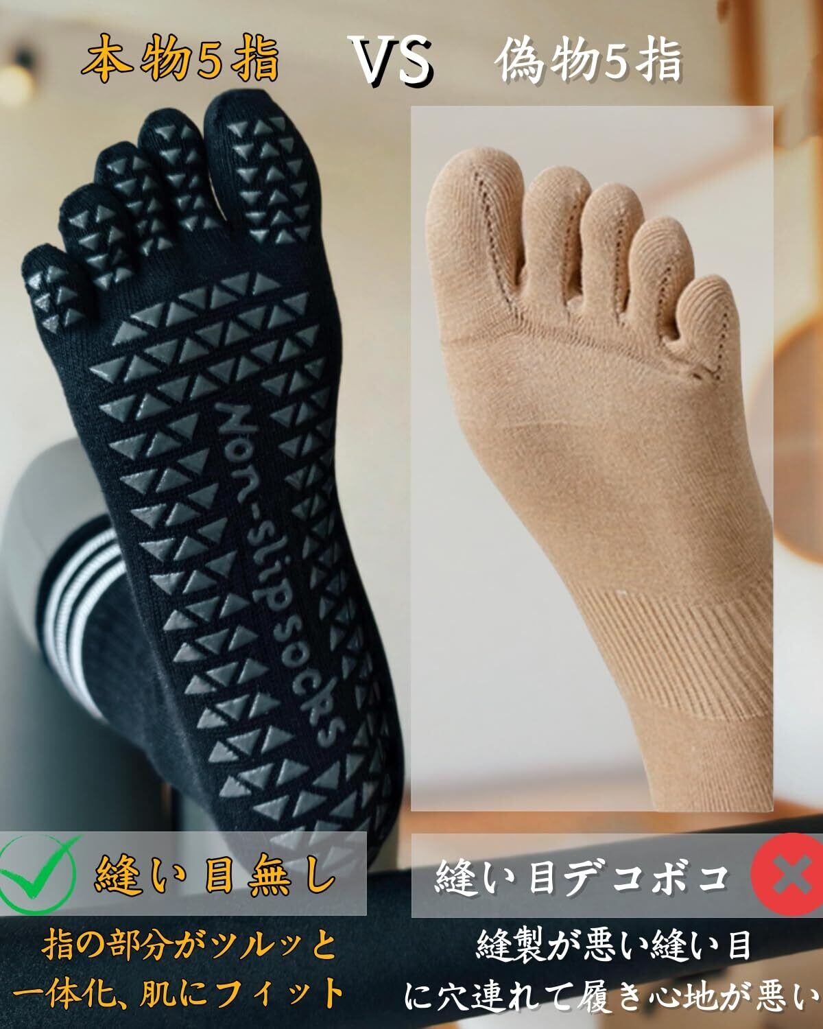 Point 2【五本指(指先あり)】指同士の圧迫や摩擦を軽減、指の自由な動きをサポート。足のバランスが改善されます。また指の間の通気性が向上し、湿度が抑えられます。もちろん指先までシッカリ滑り止め、グリップ力も向上します。