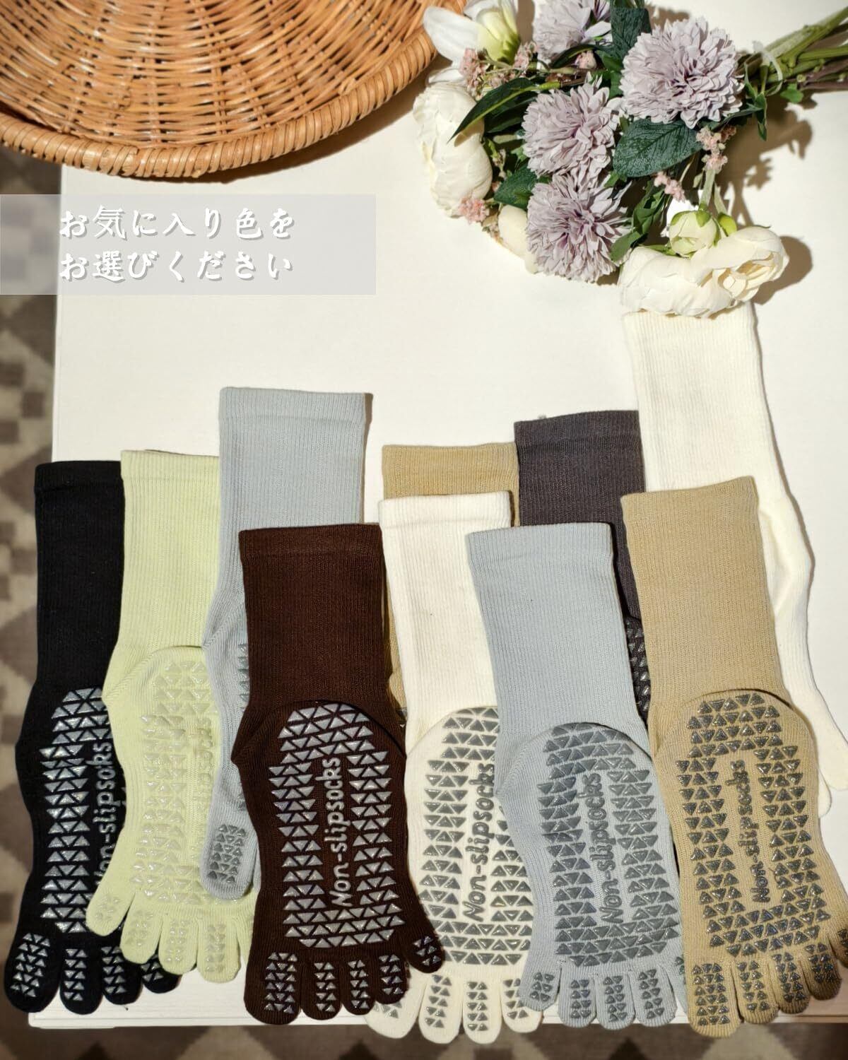 Point 1【商品詳細】ヨガ・ピラティス・ダンス等に大人気の滑り止め付き5本指ヨガソックスが新登場!①日本サイズ:約22.5-25cm対応②素材:コットン、ポリウレタン(滑り止め:シリコン)③カラー:ブラック、ホワイト、グリーン、ライトグレー、カーキ、ダークグレー、ブラウン