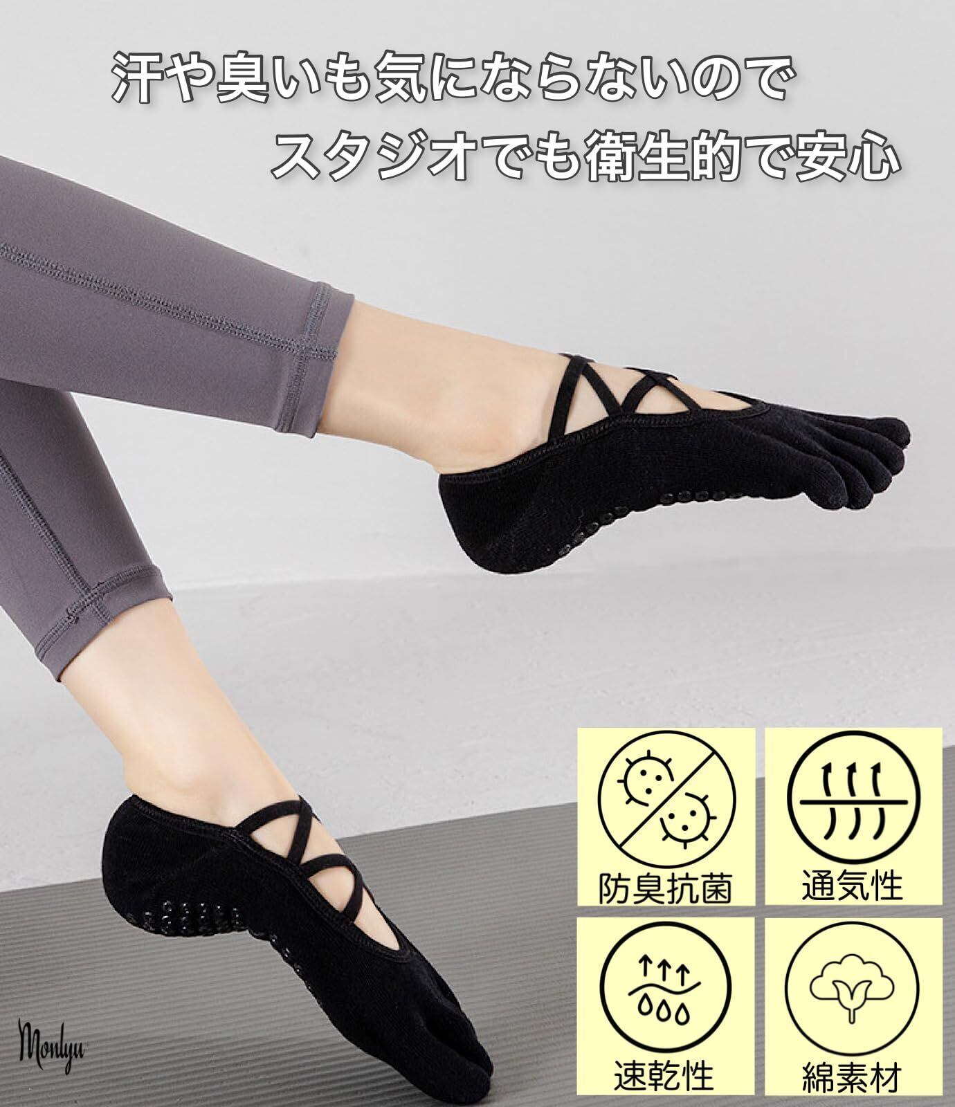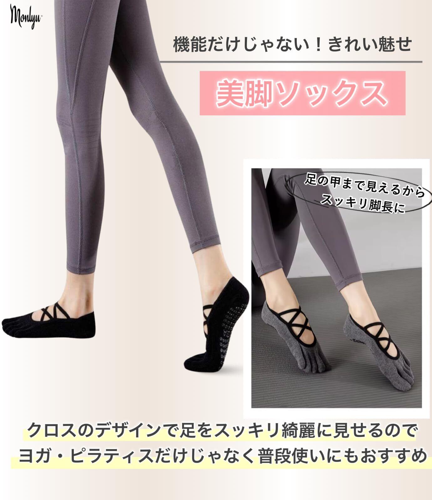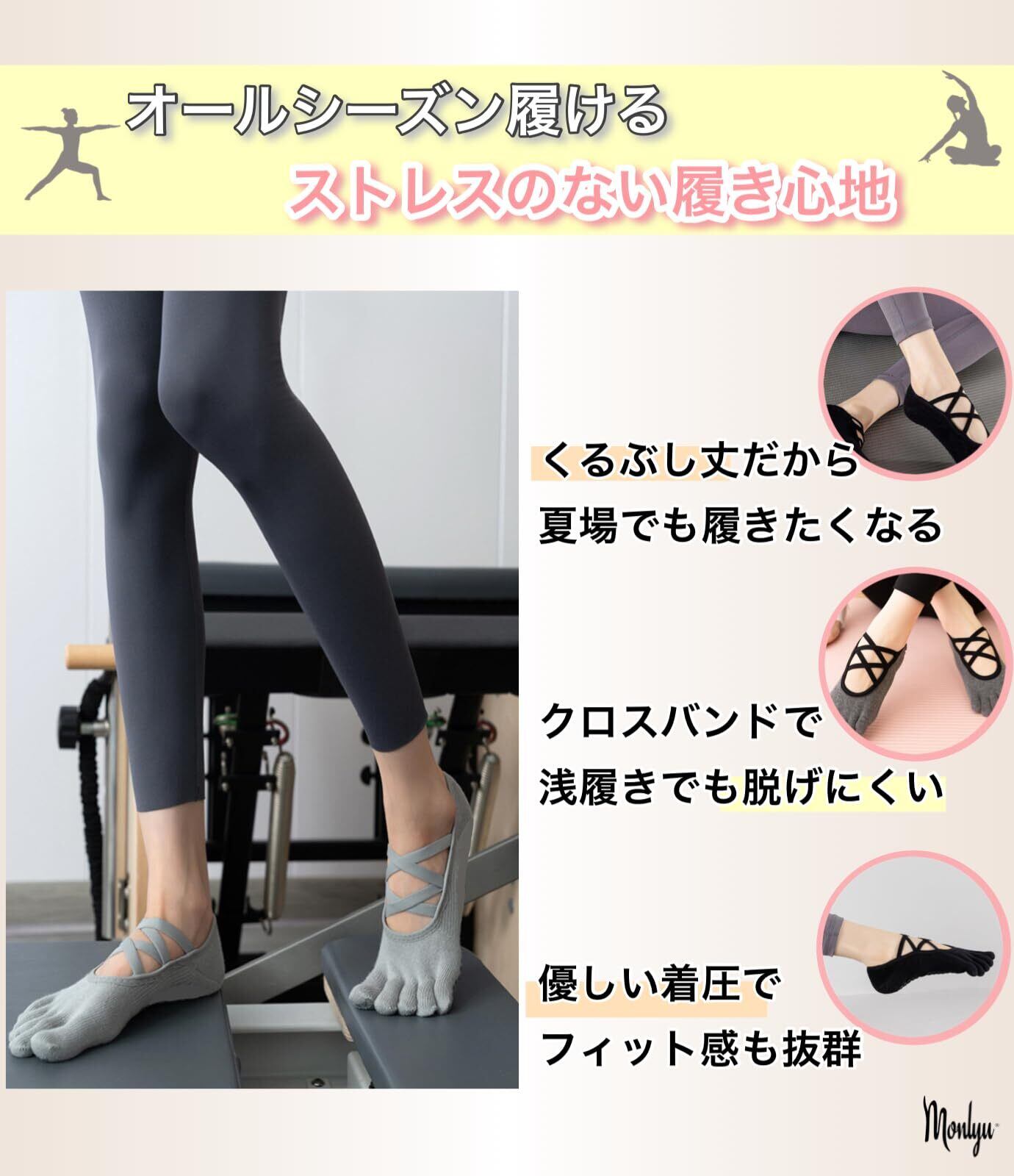 [Monlyu] ピラティス 靴下 ヨガソックス 5本指 滑り止め クロスバンド レディース ピラティスソックス ヨガ スポーツ ジム フィットネス グリップ ソックス 指あり 指なし つま先なし すべりどめ 抗菌防臭 くつした くつ下 吸湿性 通気性 速乾