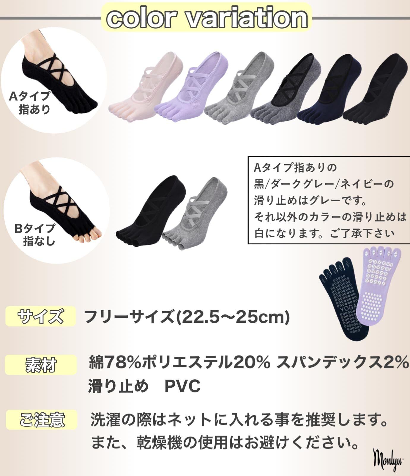 【選べる2タイプ・豊富なカラー】「指あり」「指なし」から選べる2パターン展開。シンプルから可愛いカラーまで揃っており、ヨガウェアや気分に合わせてコーディネート可能。【サイズ】フリーサイズ(22〜25cm)