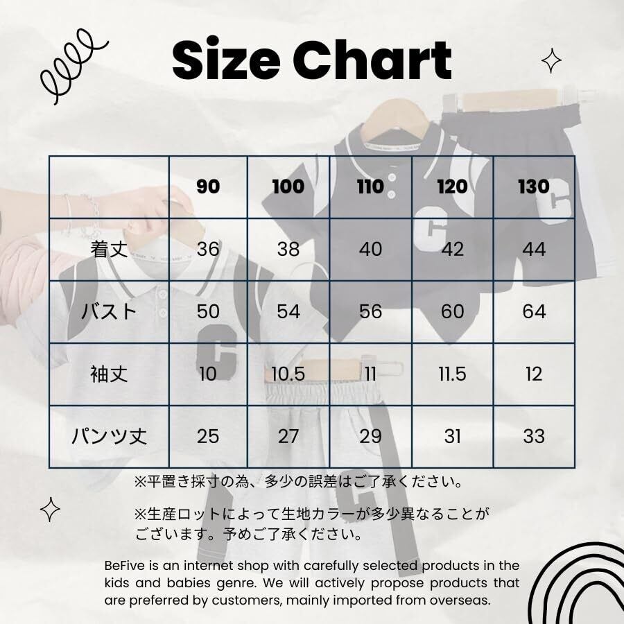 【サイズ】90cm、100cm、110cm、120cm、130cm ■90 size:着丈 36、バスト 50、袖丈 10、パンツ丈 25 ■100 size:着丈 38、バスト 54、袖丈 10.5、パンツ丈 27 ■110 size:着丈 40、バスト 56、袖丈 11、パンツ丈 29 ■120 size:着丈 42、バスト 60、袖丈 11.5、パンツ丈 31 ■130 size:着丈 44、バスト 64、袖丈 12、パンツ丈 33