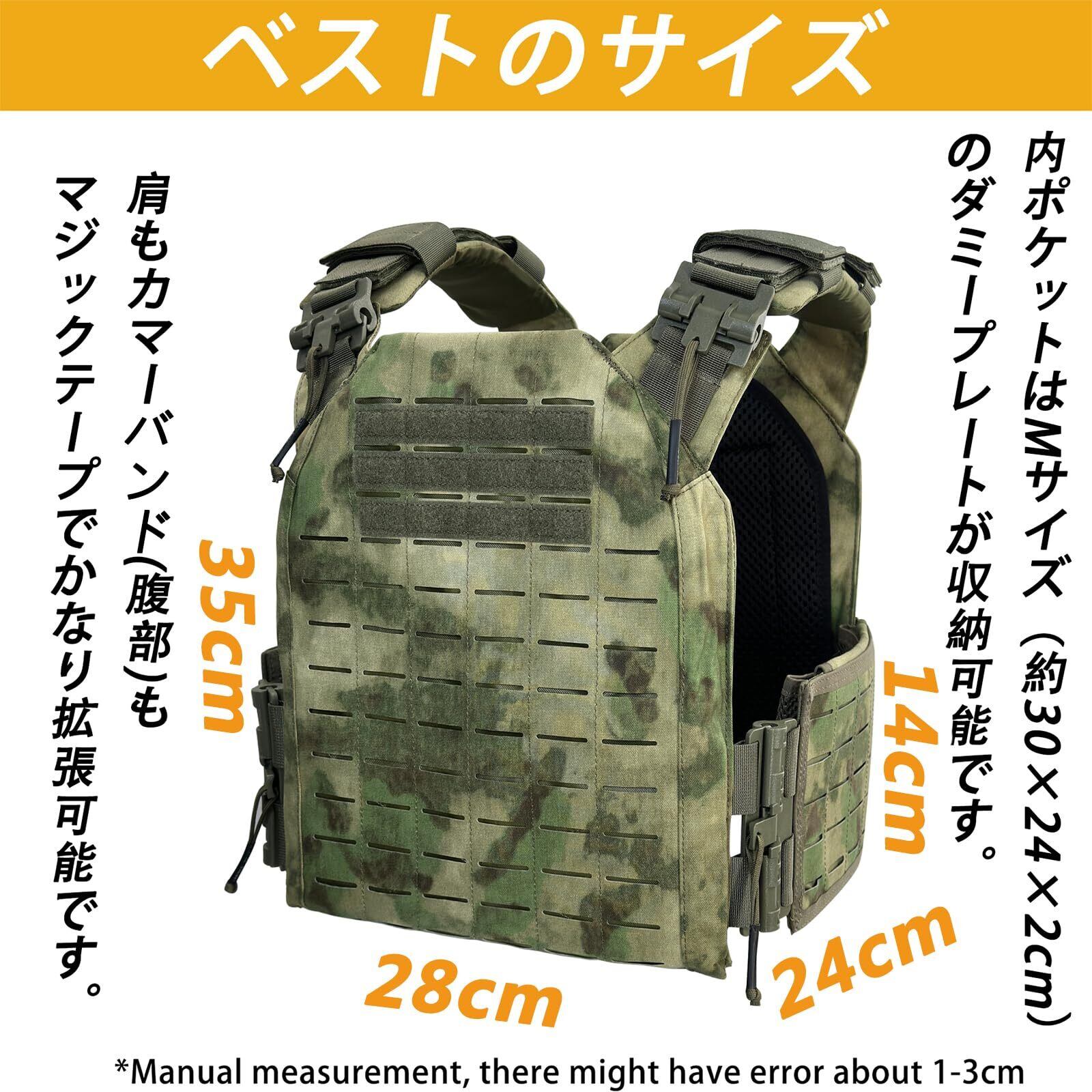 【ベストのサイズ】M~4XLまで対応(マジックテープで調整可)・肩寸:15~20㎝まで調整可・高さ:45~60㎝・横幅:75~125㎝・重量:約1.12㎏。プレキャリの全てのプレートが着脱可。8色:マルチカム/カーキ/レンジャーグリーン/黒/マルチカム・ブラック/コヨーテ・ブラウン/マルチカム・トロピック/ATFG。