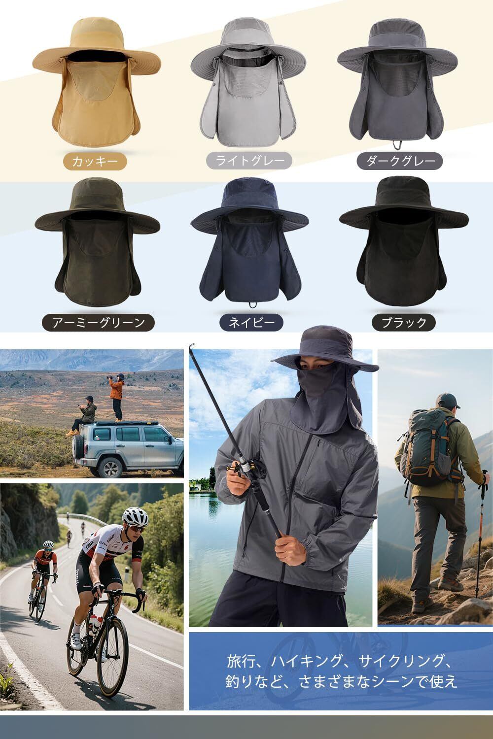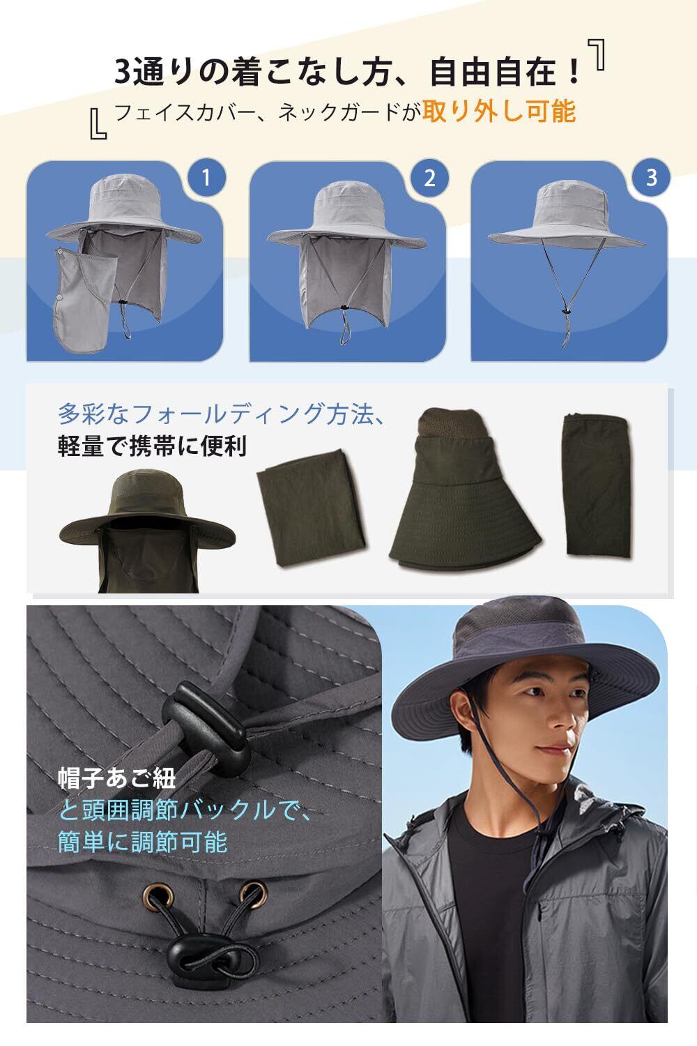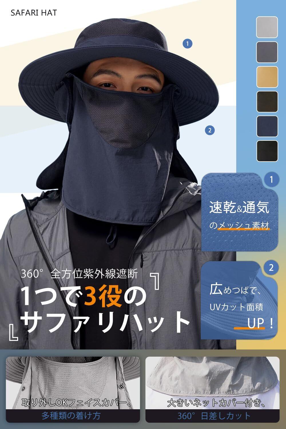 【 サファリハット & フェイス & ネックカバー1つで3役 】フィッシングハットに、ネックガード・フェイスカバーもついた、1つで3役の機能性メンズサファリハットです。顔・首・頭の日焼け防止としてはもちろん、暑さ対策や虫除け、フェイスカバー代わりにもなる便利グッズ。フェイスカバーとネックガードはボタン止めで簡単に取り外せし可能です。3パターンでの着こなし、ご自由に組み合わせます。