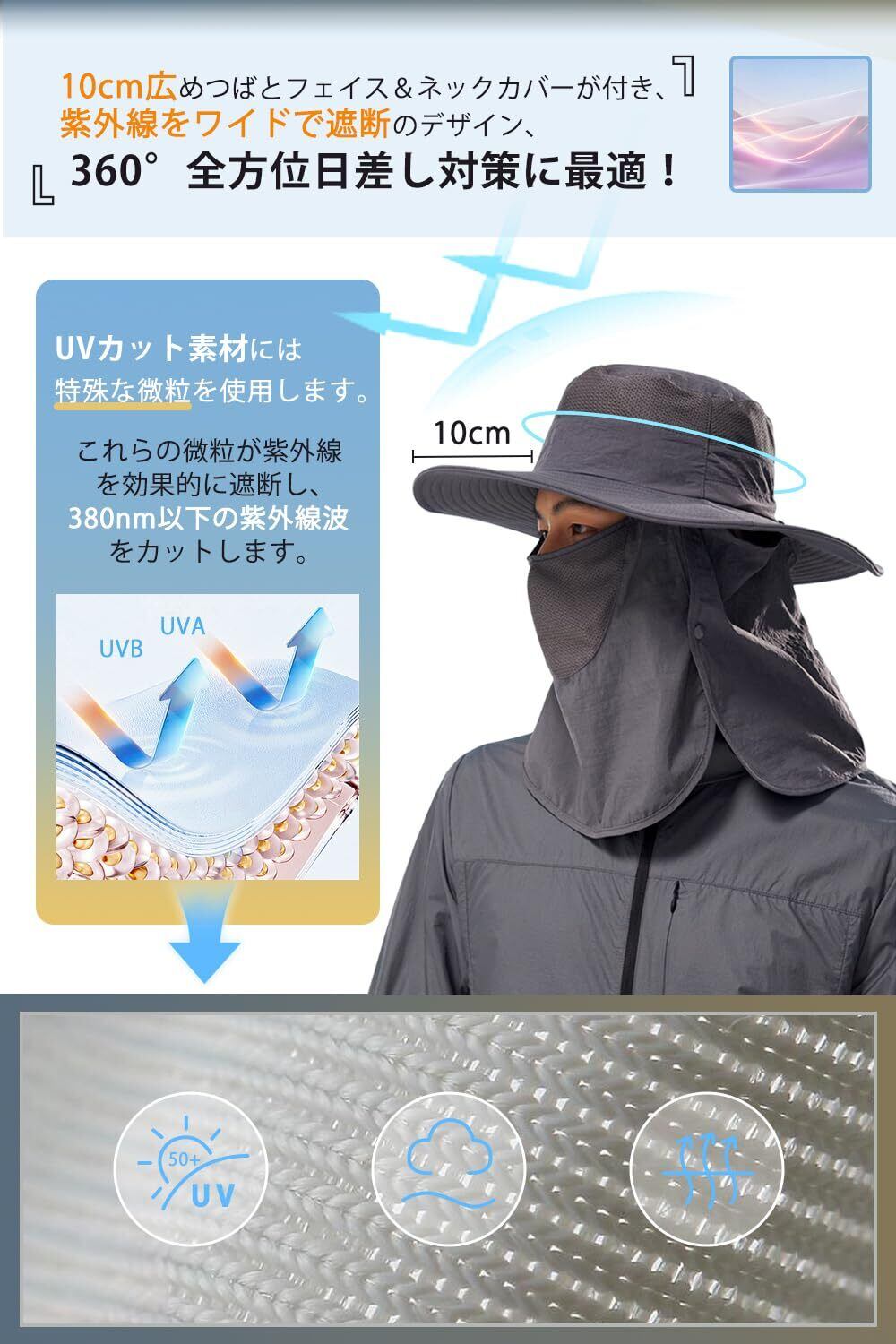 【360°UVカット&肌を保護し】UPF 50+認証済み、UVカット99.9%以上で、つばが10cm広めで、かぶるだけでだけで簡単に日焼け止め、UV効果の強い日差し季節にのアウトドアは最適です。360度全方位からの日差しをしっかり防御、紫外線による肌へのダメージを最小限に抑えます。視界を遮ることはなく肌を保護し、完全防備のUVカット・熱中症対策用日除け帽子です!