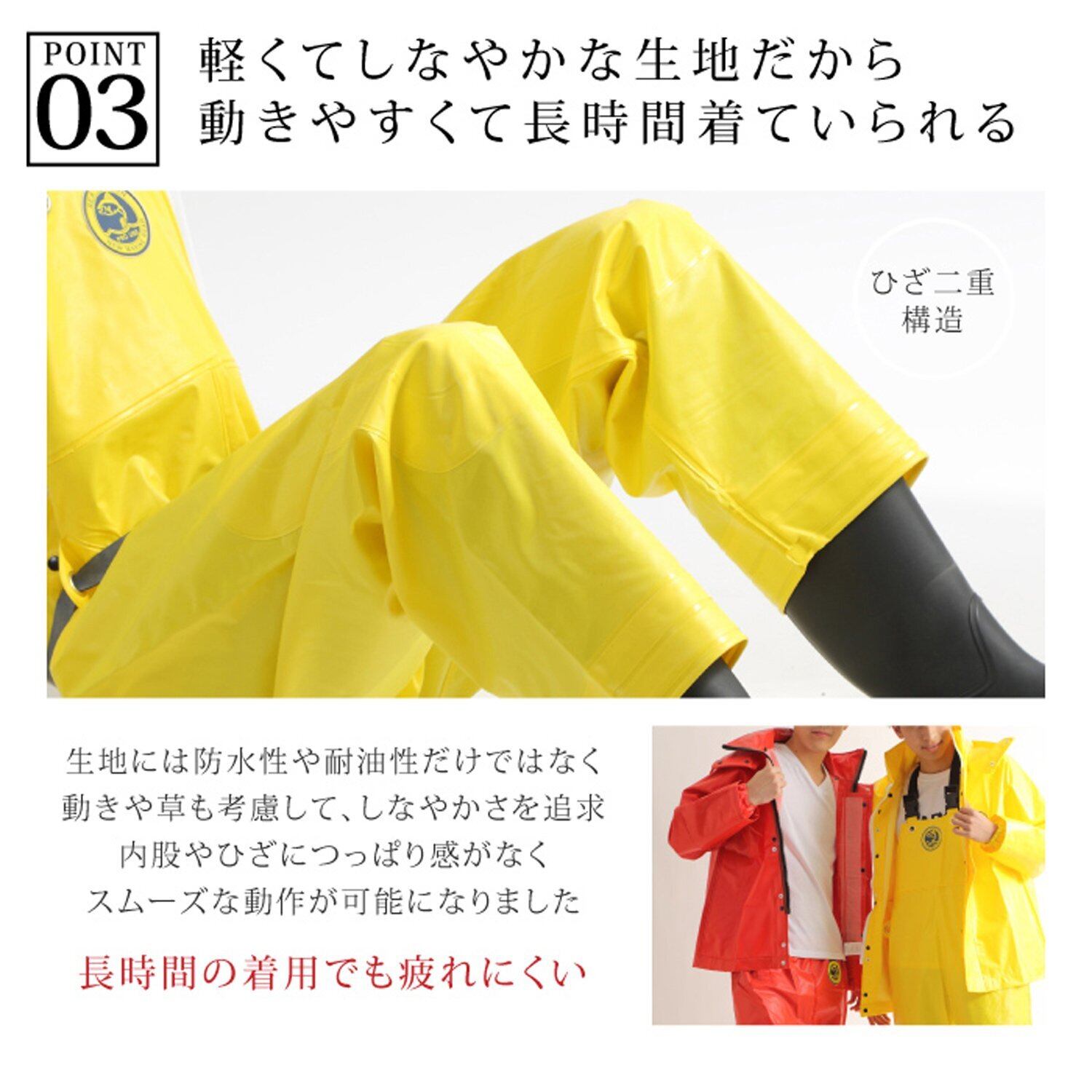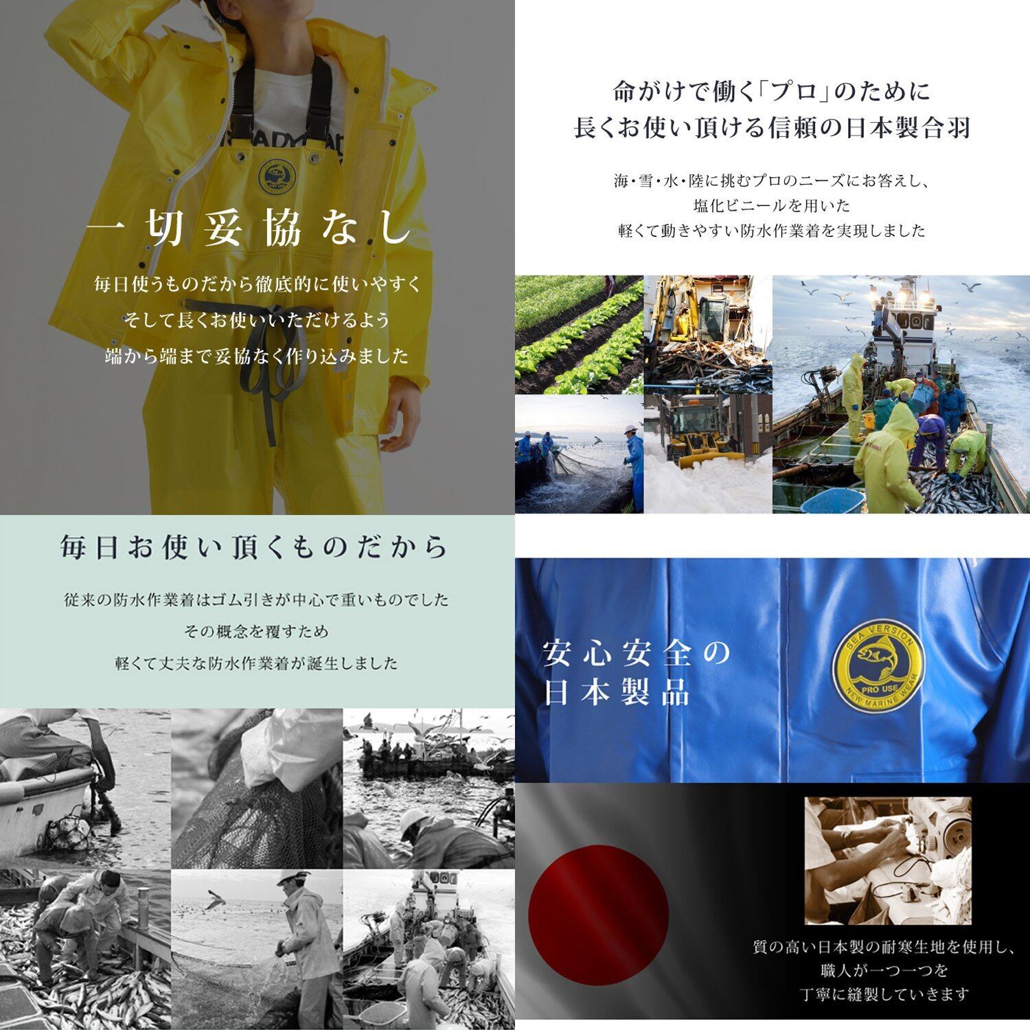 日本製の高品質防水生地を使用した防水作業着が特に有名。