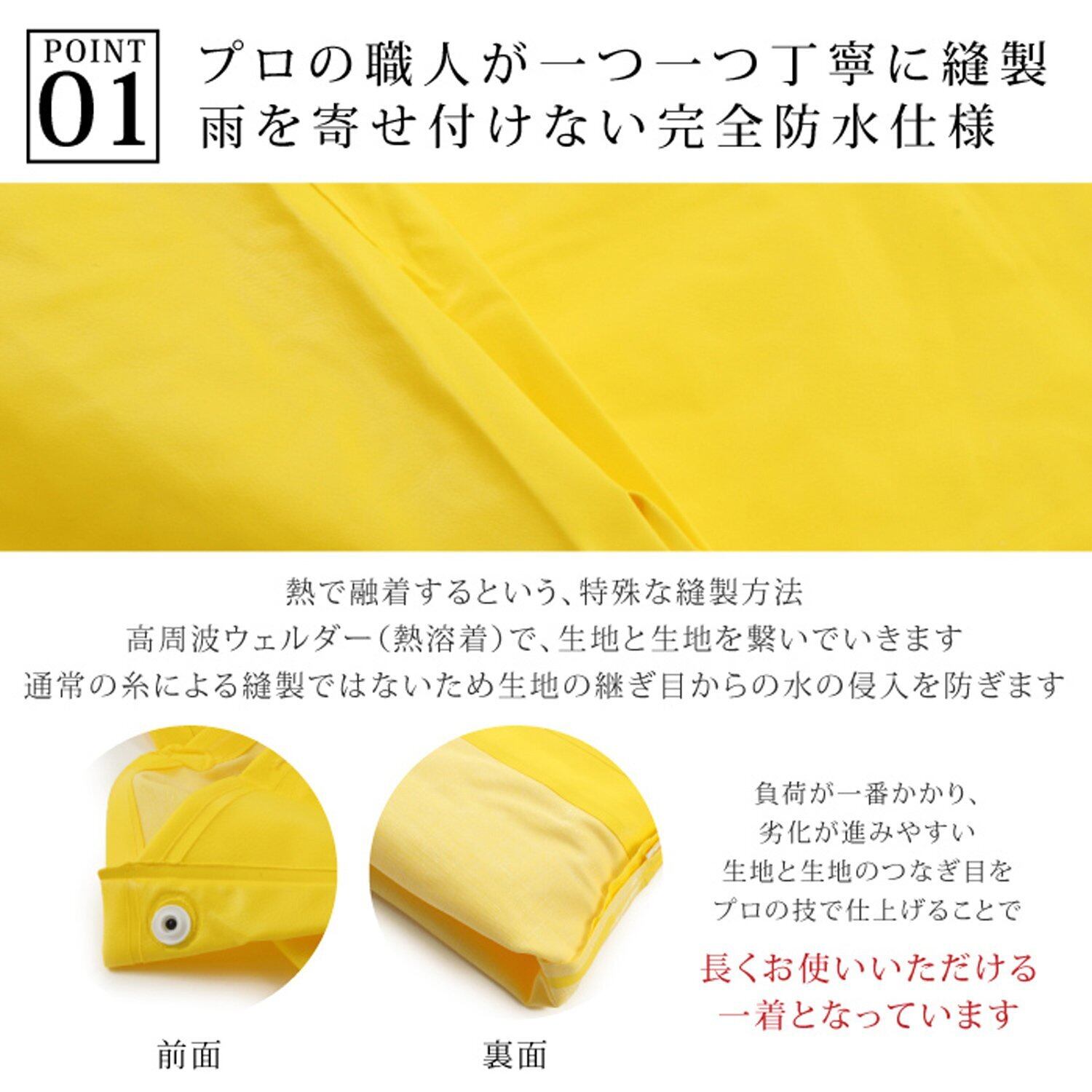 完全防水仕様の日本製生地を使用し、徹底的に防水するために水のかかる想定ヵ所は全てウェルダー加工されています。