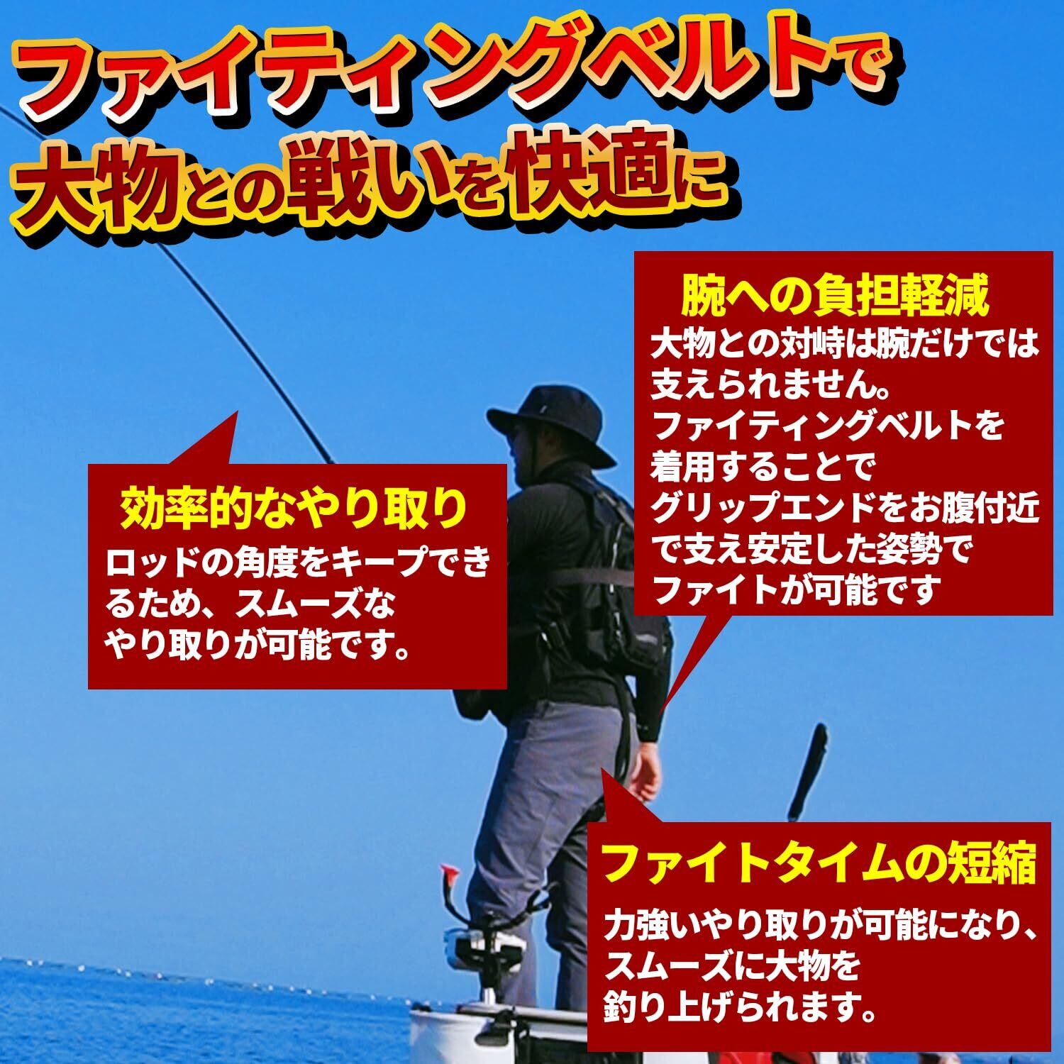 【体への負担軽減】フィッシングベルトを使用することによりお腹付近でグリップエンドを固定!ロッドを安定させることでオフショア釣り(船釣り)の不安定な状況でもパワフルな釣りをサポートします。