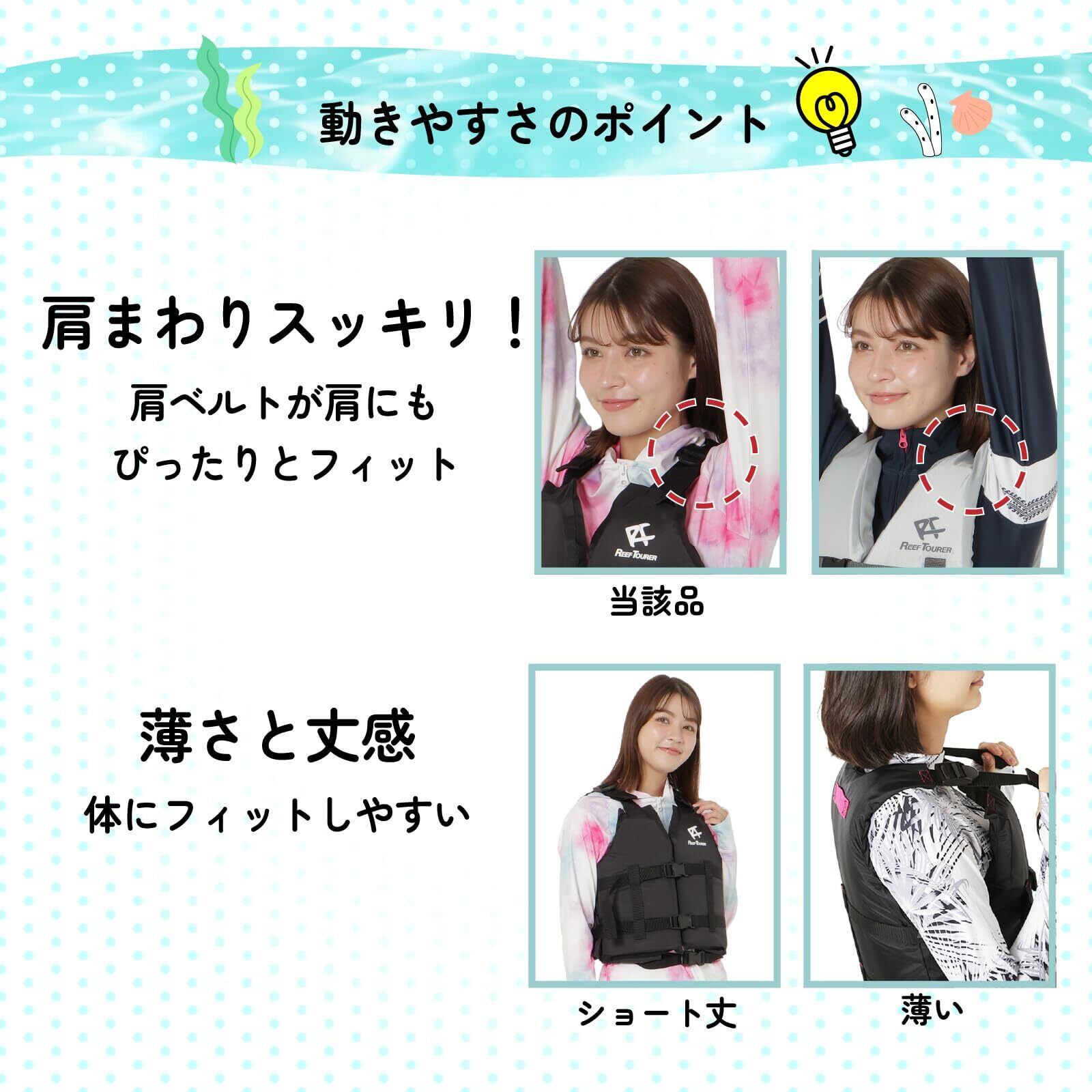 【体の動かしやすさを極めた設計】REEFTOURER(リーフツアラー)のシュノーケリングベスト スリムは、体の動かしやすさに焦点を当てたシュノーケリングベストとなっています。そのため、従来のシュノーケリングベストと比べ浮力を75%に抑えています。浮力を抑えることで、ベストの厚みを減らし、体にフィットしやすくするとともに、不要なベストの浮き上がりを削減。体が動かしやすいので、水の抵抗がある水中でも泳ぎやすいベストとなっています。浮力を抑えると聞くと不安になる方もいらっしゃるかもしれませんが、日本のダイビング器材メーカーとして、シュノーケリングに適切な浮力をしっかり検討した十分な浮力のシュノーケリングベストとなっていますのでご安心ください! また、浮力を抑えることで軽さも実現しています。Sサイズであれば295gと300gをきる軽さで、小さなお子さまやでも負担なく着用いただける重さとなっています! まさに、快適性と安全性を両立した1品です。