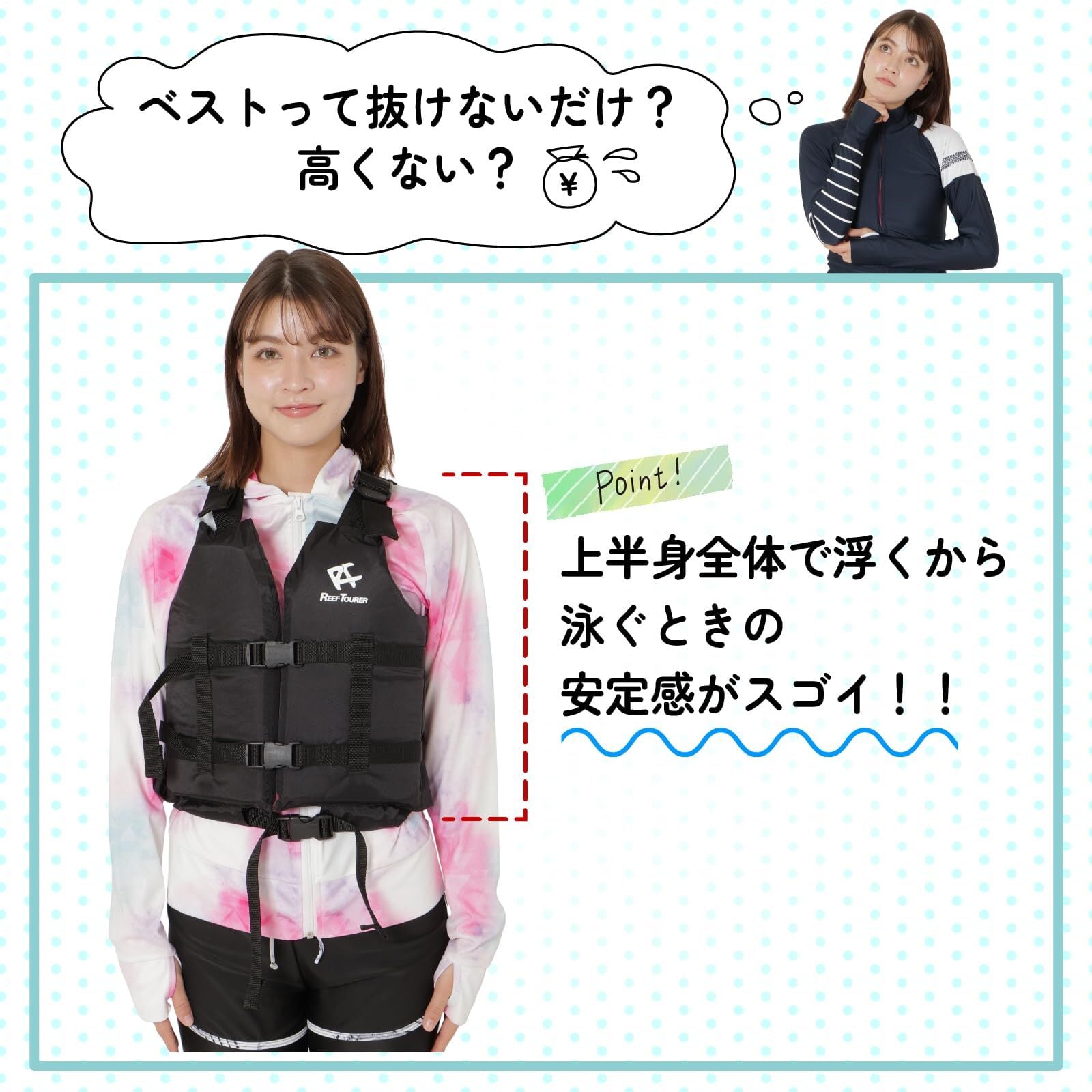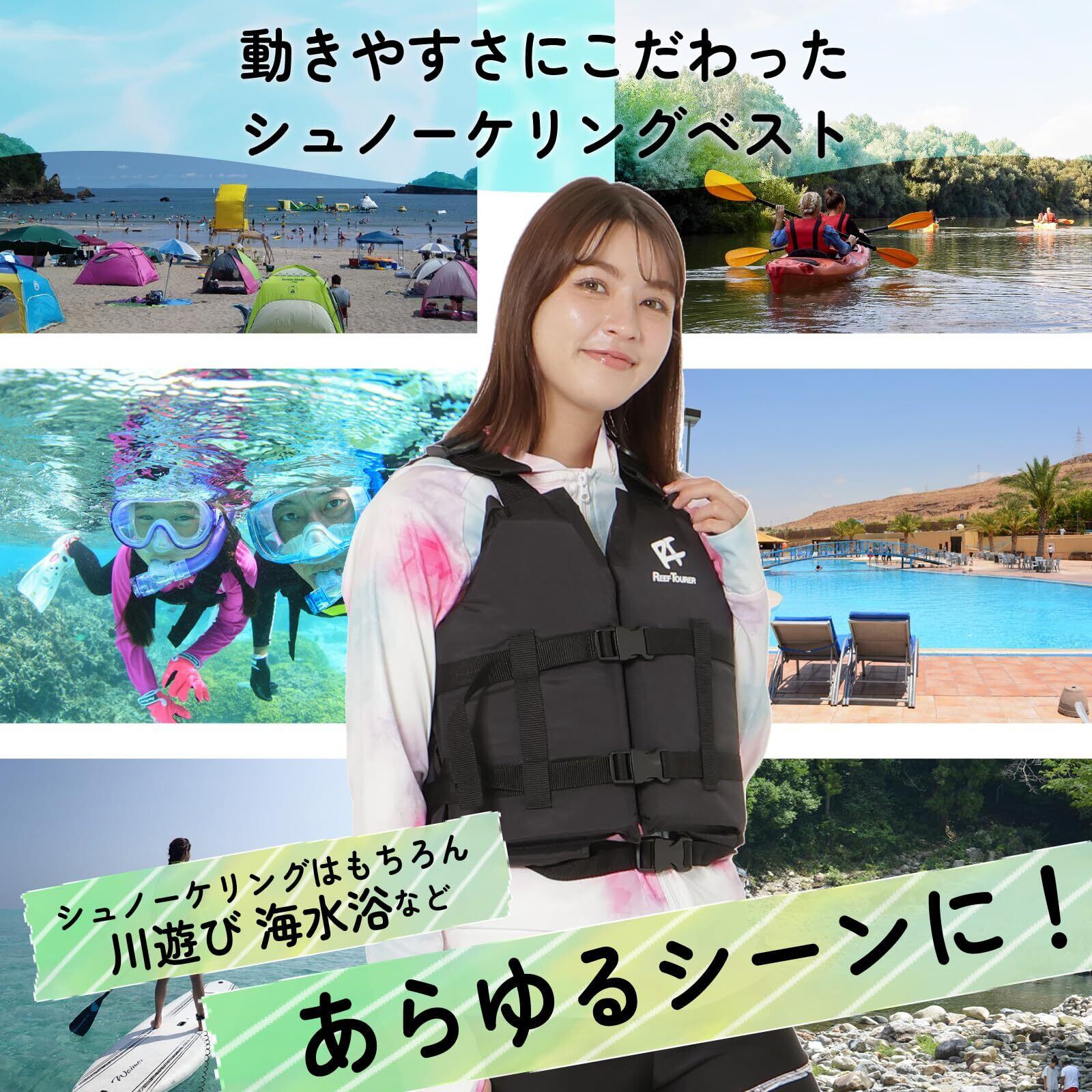【シュノーケリング(遊泳)専用ライフジャケット】海や川で着用するベストというと「ライフジャケット」を連想する方も多いのでないでしょうか?その「ライフジャケット」と「シュノーケリングベスト」は全く異なる物だとご存じでしょうか。「ライフジャケット」は万が一の際に命を守る「救命胴衣」であり、「シュノーケリングベスト」はシュノーケリングや海水浴で「より快適な泳ぎをサポートするジャケット」となっています。もちろん、体を浮かせるのに十分な浮力を持っているので、万が一の際も安心。シュノーケリングベストは云わば「シュノーケリング(遊泳)専用のライフジャケット」なのです。