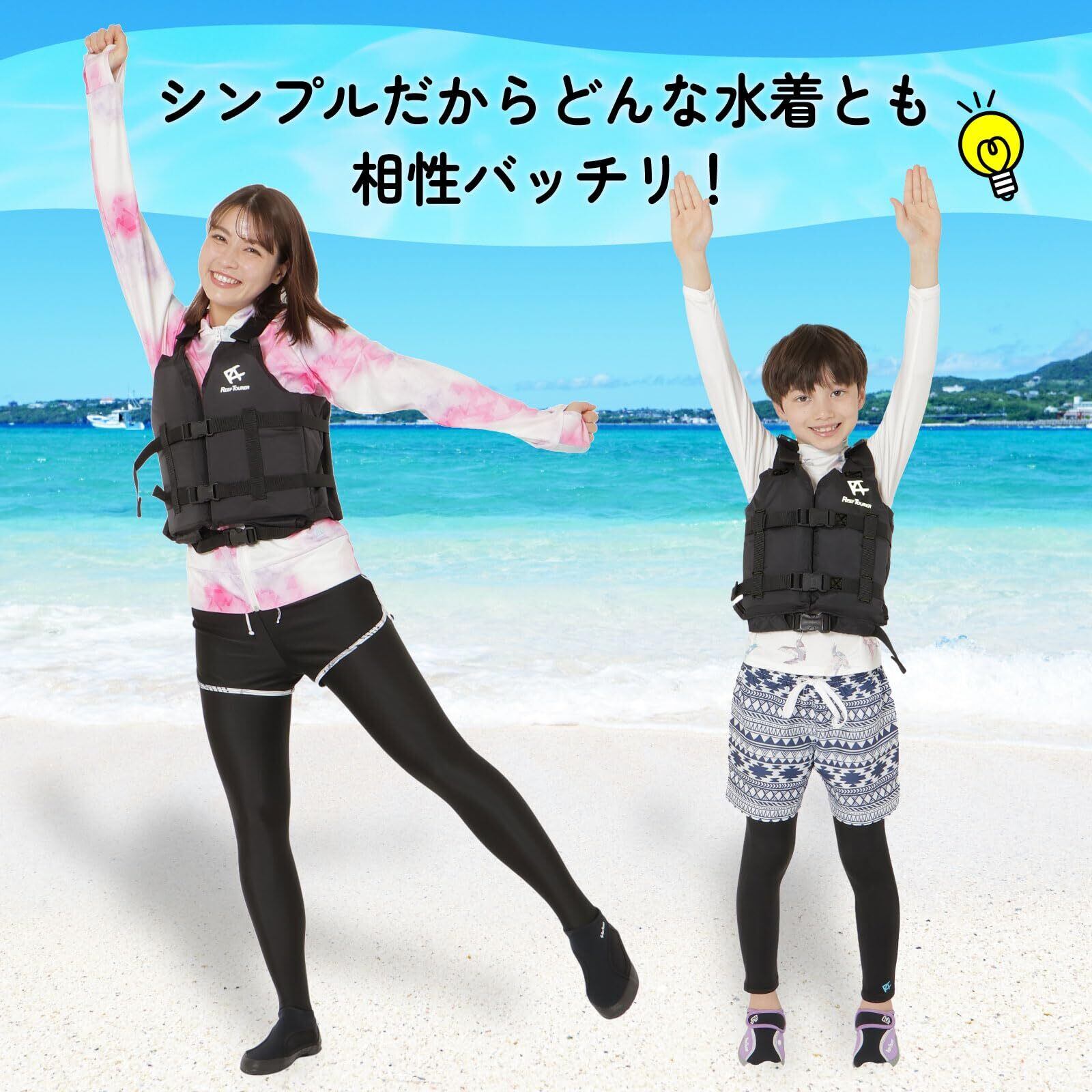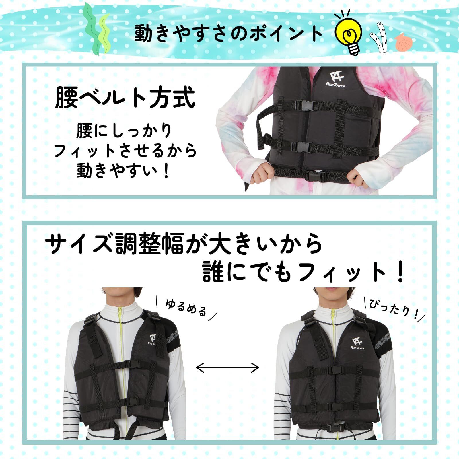 【浮き輪よりも泳ぎやすい! 】「浮き輪より泳ぎやすい」というお声をいただいております! 海の中でも簡単に着脱できる浮き輪は便利ですが、シュノーケリングのように長時間泳ぐ際には体にフィットして自由に動けるシュノーケリングベストがおすすめ! 浮き輪だと体が抜けてしまうといったこともありますが、シュノーケリングベストであればしっかりフィッティングすればその心配は無用。さらにつけっぱしにできるので、不意な事故の抑制にもつながります。浅瀬での水遊びには浮き輪、しっかり泳いだりシュノーケリングをする際はシュノーケリングベストなど、用途にあわせてお選びいただくと、より海や川のレジャーをお楽しみいただけると思います。