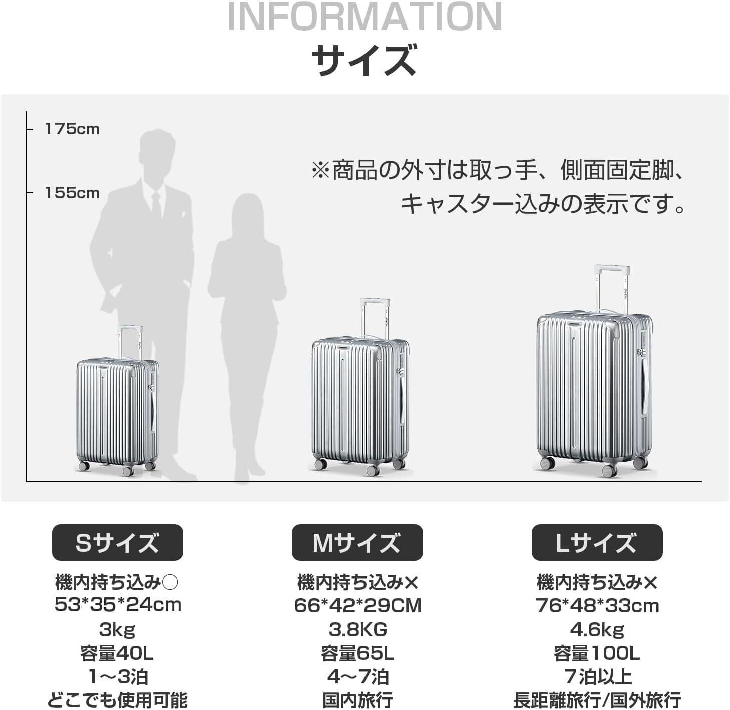【1年間安心保証&アフターサービス】 商品到着後30日以内の破損・不具合には迅速対応いたします。返品・交換にも対応可能で、はじめてスーツケースをご購入される方も安心。ご注文前に必ずサイズをご確認いただき、納得の上でお選びください。