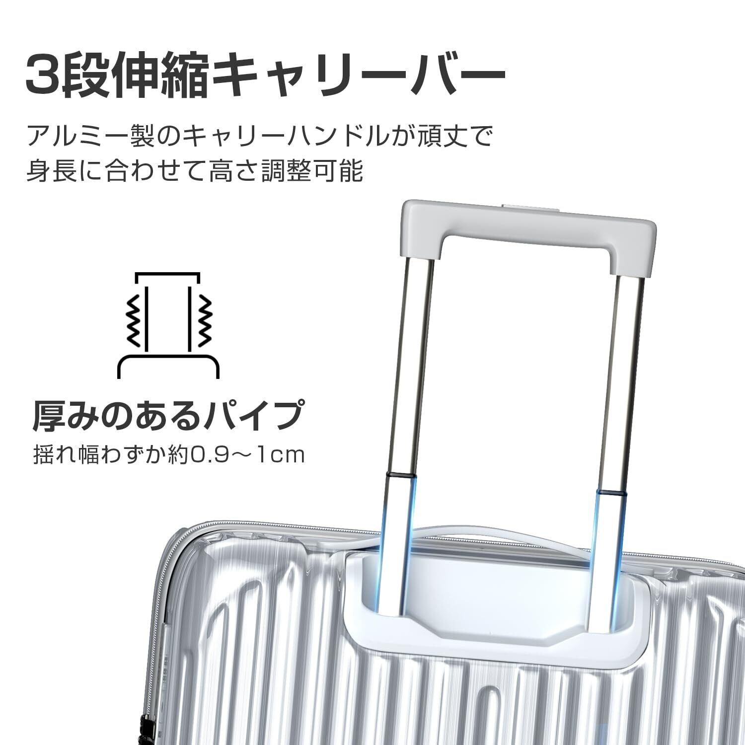 【3段階調整キャリーバー&荷崩れ防止ベルト】 身長や利用シーンに応じて3段階に長さを調整できるキャリーバーを採用。さらに、内部には手荷物をしっかり固定するベルトを備え、移動中でも荷物が乱れにくい設計です。必要なアイテムをすぐ取り出しやすく、使い勝手の良いスーツケースとなっています。